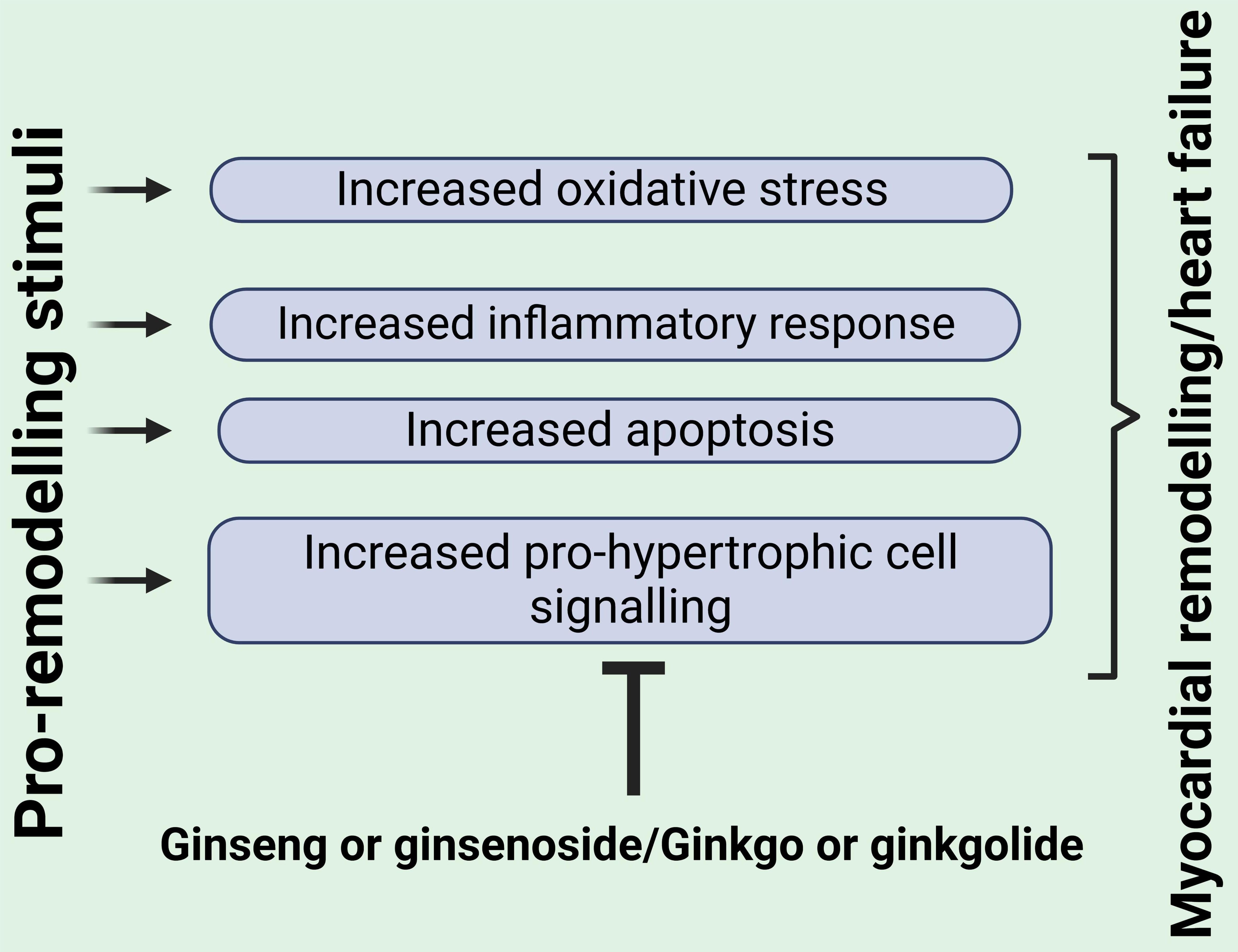 Fig. 1.Illustration showing a number of the key mediators of the remodeling process leading to heart failure following initial stimulation and which have been shown to be targeted by ginseng and ginkgo or their bioactive constituent components. See text for details. Created with BioRender.com.