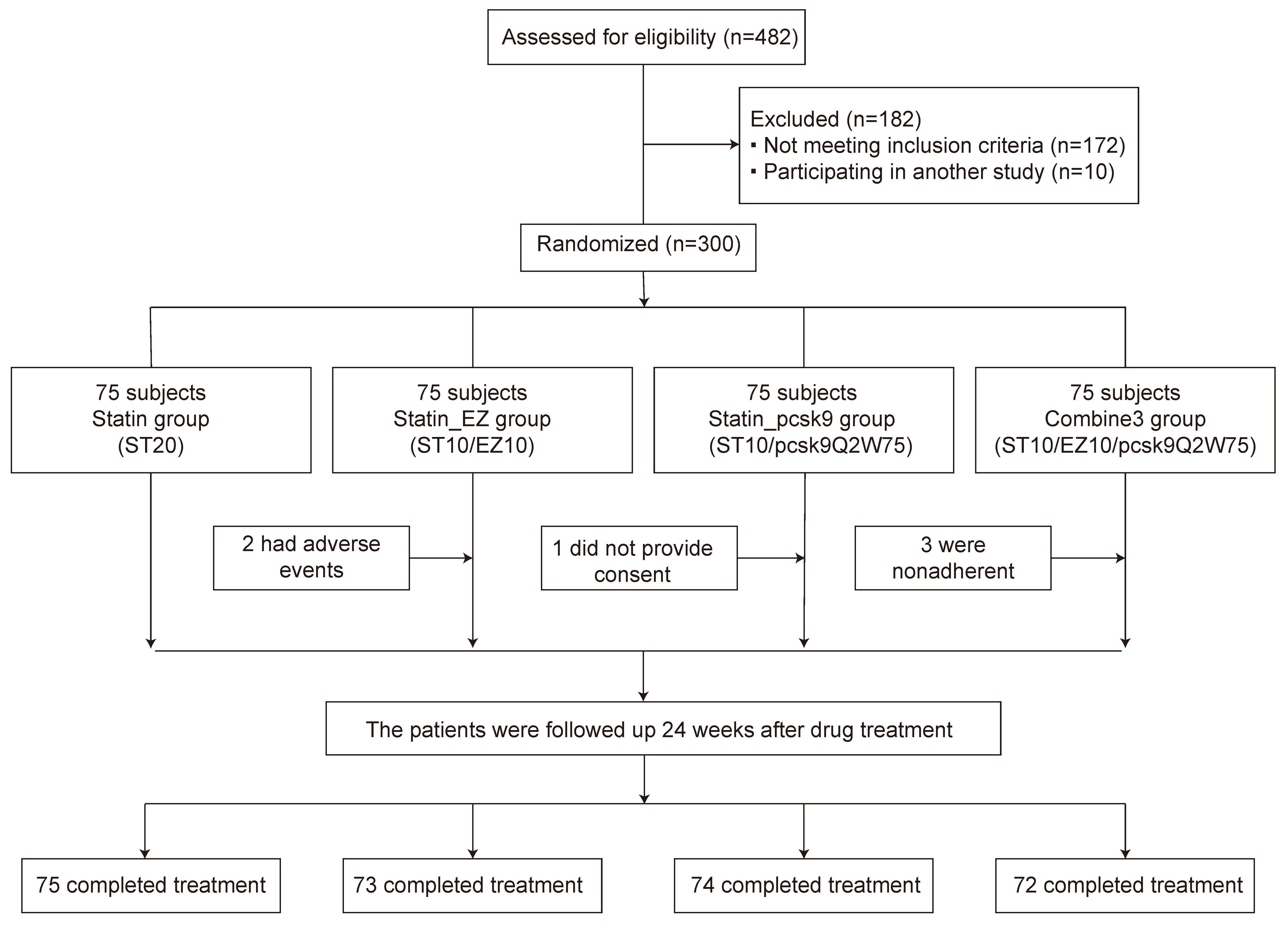 Fig. 1.Flow chart of patient enrollment in the study. Statin_EZ group: statin + ezetimibe; statin_pcsk9 group: statin + a PCSK9 inhibitor; combine3: statin + ezetimibe + a PCSK9 inhibitor; ST20: statin at 20 mg daily; ST10/EZ10: statin at 10 mg plus ezetimibe at 10 mg daily; ST10/pcsk9Q2W75: statin at 10 mg daily plus a pcsk9 inhibitor at 75 mg every 2 weeks; ST10/EZ10/pcsk9Q2W75: statin at 10 mg plus ezetimibe at 10 mg daily and a PCSK9 inhibitor at 75 mg every 2 weeks.