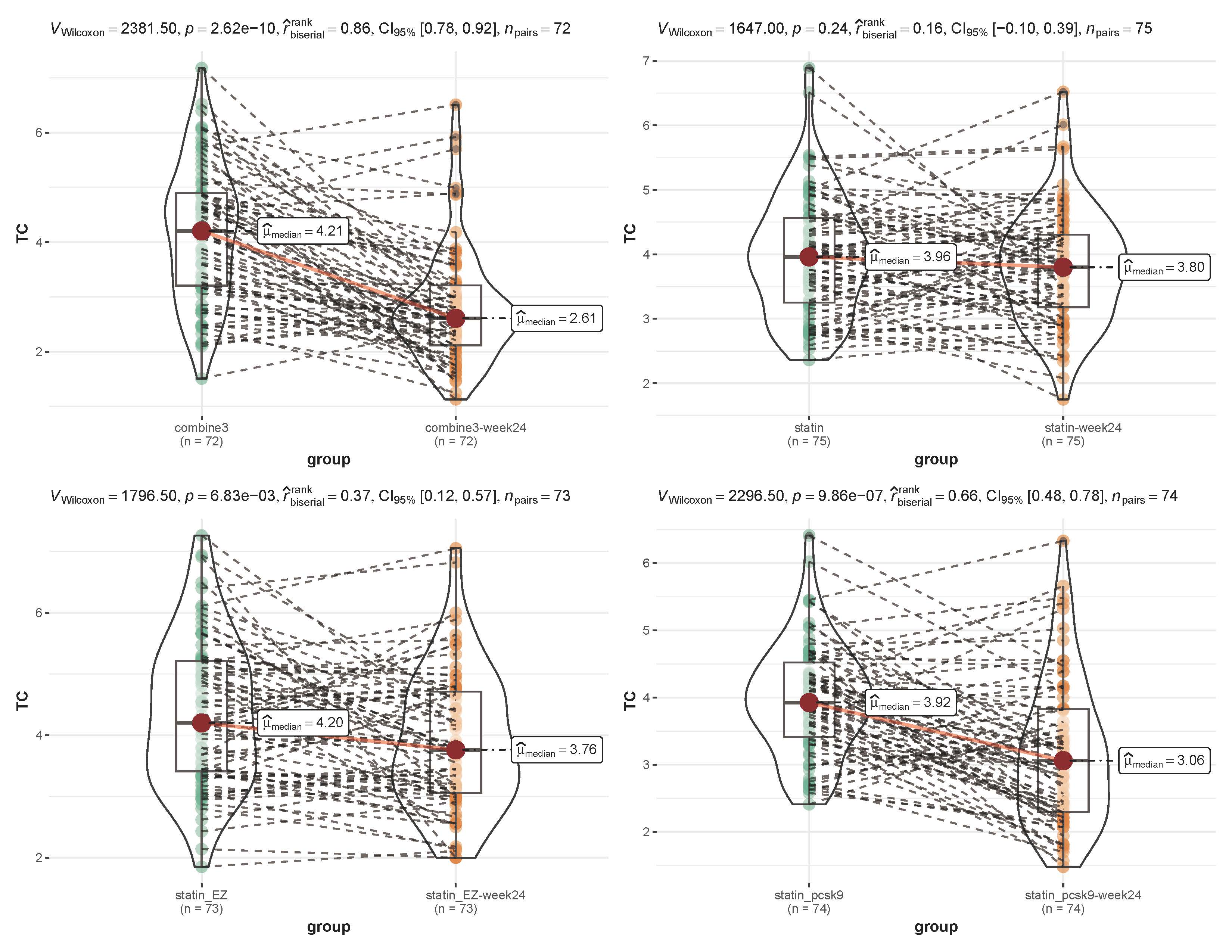 Fig. 2.Comparison of the total cholesterol level before and after treatment within each group. Combine3 group: statin (10 mg/d) + ezetimibe (10 mg/d) + the PCSK9 inhibitor alirocumab (75 mg Q2W); statin_pcsk9 group: statin (10 mg/d) + the PCSK9 inhibitor alirocumab (75 mg Q2W); statin group: rosuvastatin (20 mg); statin_EZ group: statin (10 mg/d) + ezetimibe (10 mg/d). A nonparametric test (Wilcoxon signed-rank test) and the rank-biserial correlation was applied for non-parametric tests of differences. TC, total cholesterol.