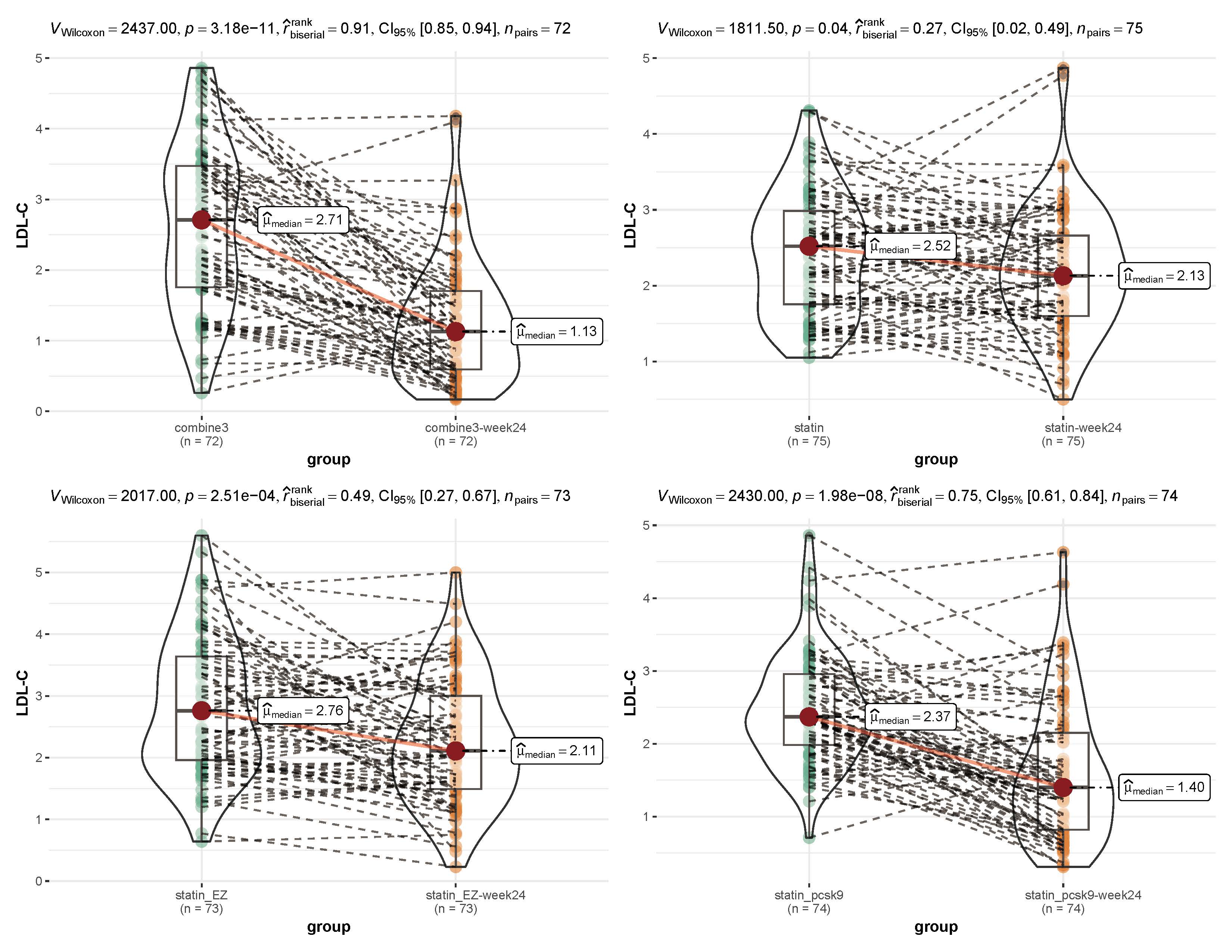 Fig. 3.Comparison of the low-density lipoprotein cholesterol (LDL-C) level before and after treatment within each group. Combine3 group: statin (10 mg/d) + ezetimibe (10 mg/d) + the PCSK9 inhibitor alirocumab (75 mg Q2W); statin_pcsk9 group: statin (10 mg/d) + the PCSK9 inhibitor alirocumab (75 mg Q2W); statin group: rosuvastatin (20 mg); statin_EZ group: statin (10 mg/d) + ezetimibe (10 mg/d). A nonparametric test (Wilcoxon signed-rank test) and the rank-biserial correlation was applied for non-parametric tests of differences.