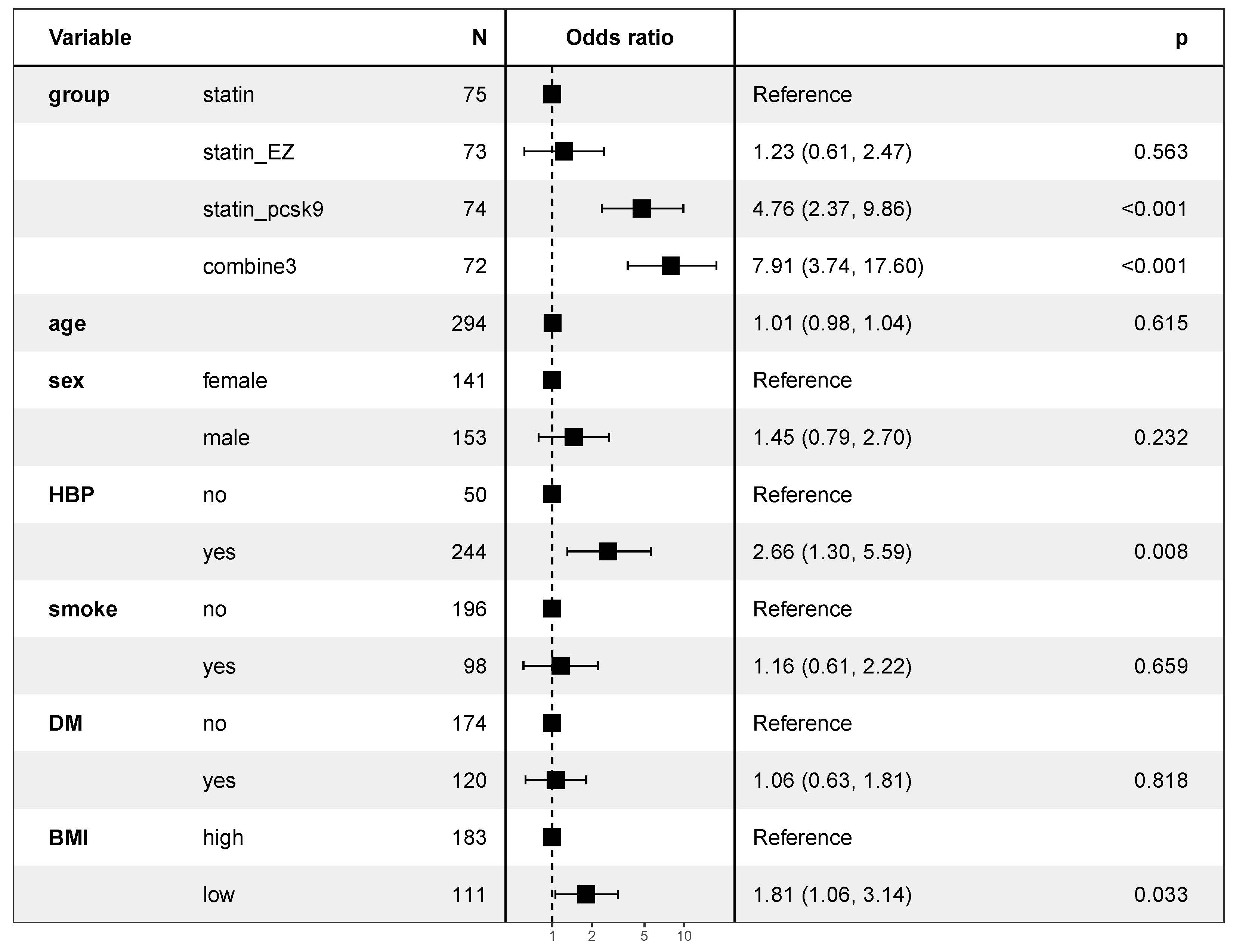 Fig. 5.Multivariate logistic regression analysis for factors related to achieving the target. EZ, ezetimibe; PCSK9, PCSK9 inhibitor alirocumab; combine3, statin + ezetimibe + alirocumab; HBP, high blood pressure; DM, diabetes mellitus; BMI, body mass index.