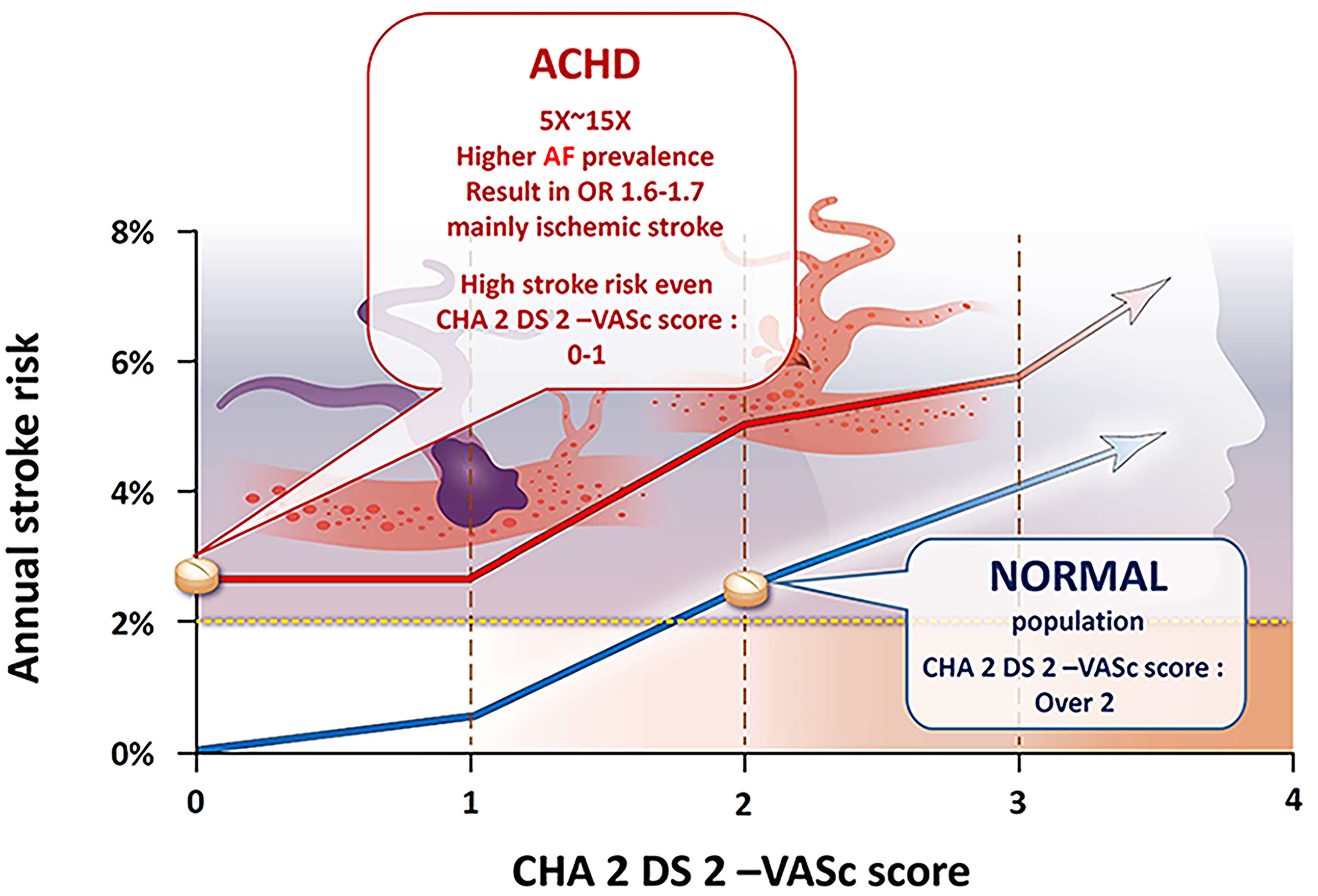 In summary, this study is the first to confirm the high prevalence of AF in Asian adults with congenital heart disease, which leads to an increased risk of ischemic stroke events. This risk is observed even at a young age (under 50 years old) or with a low CHA