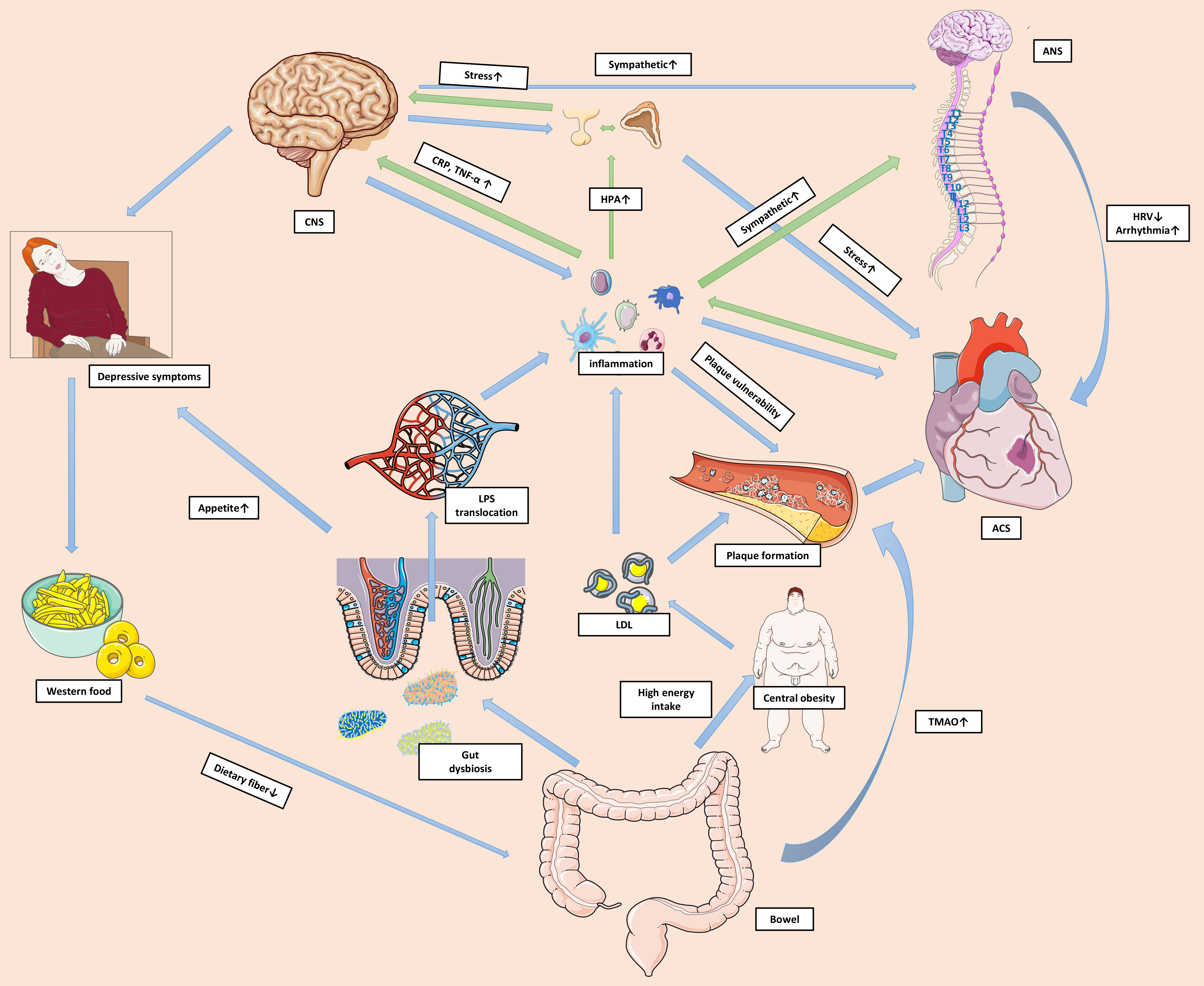 pathophysiological pathways from ACS to depression, while the blue arrows