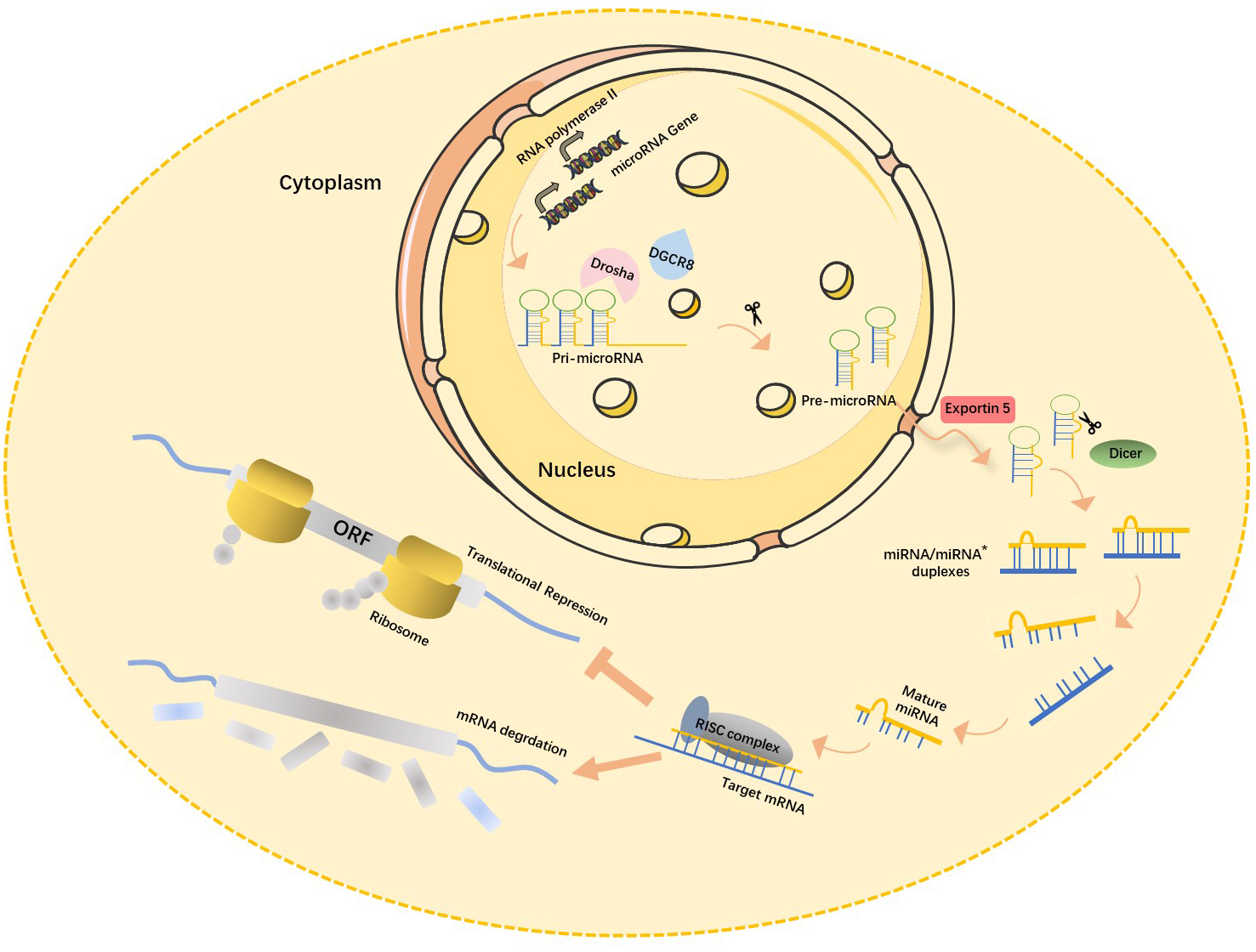 Fig. 1.Canonical miRNAs biogenesis pathway. In the nucleus, pri-miRNA, the primary transcription product of the miRNA gene, is cleaved by RNase III-Drosha enzyme to become hairpin precursor miRNA (pre-miRNA). After preliminary shearing, the pre-miRNA is transported from the nucleus to the cytoplasm under the action of the transporter Esportin-5, and then further cleaved by another RNase III Dicer enzyme to produce mature miRNA. The mature miRNAs then bind with other proteins to form RISC (RNA-induced silencing complex), which leads to target mRNA degradation or translation inhibition. miRNA, microRNAs; pri-miRNA, primary miRNA transcripts; DGCR8, DiGeorge syndrome critical region 8; ORF, open reading frame; mRNA, messenger ribonucleic acid; miRNA*, star strand of microRNA.