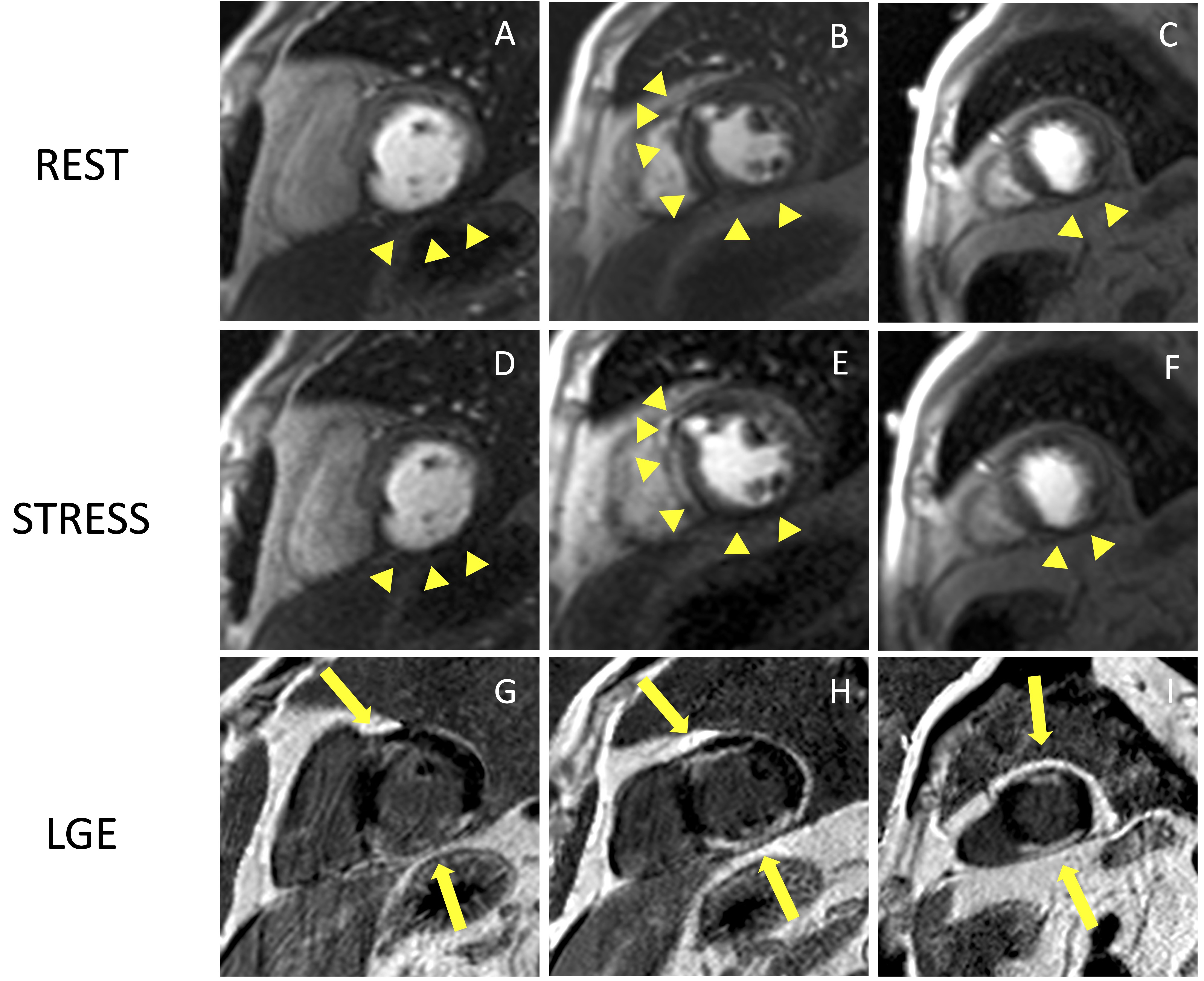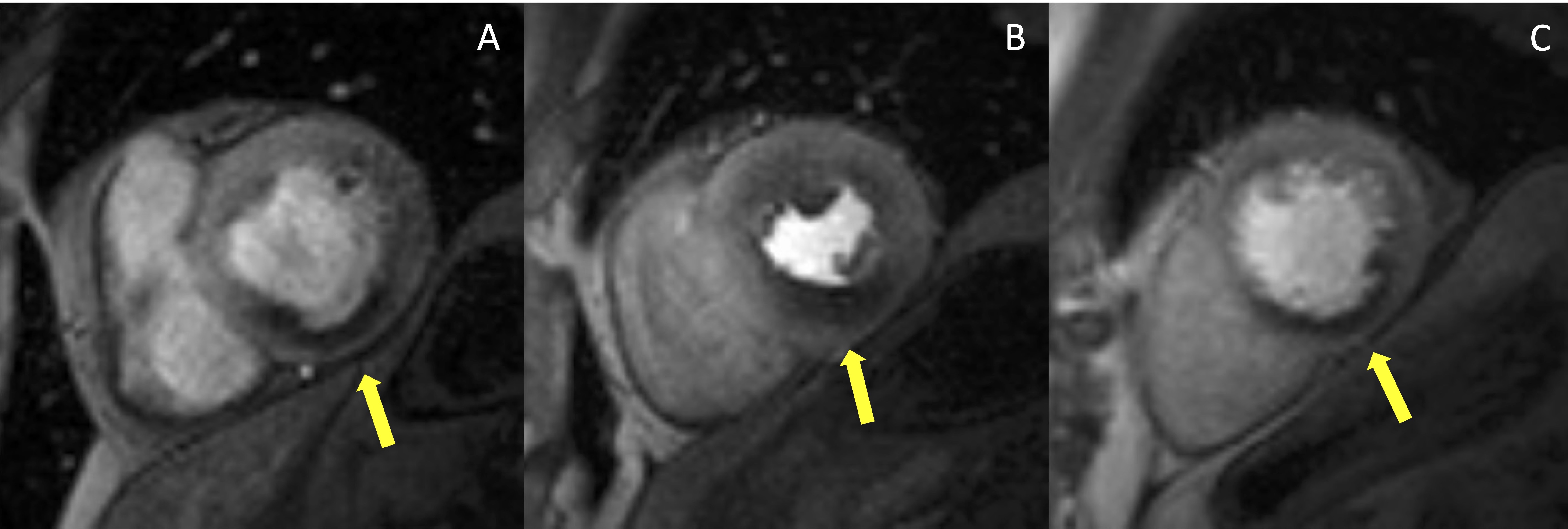 Fig. 1.Example of abnormal stress CMR. The first-pass perfusion images are usually acquired in three short axis slices, at the basal (A), mid (B) and apical (C) ventricular level during coronary maximal vasodilation. This example shows an inducible perfusion defect, appearing as a hypointense subendocardial area (indicated by the yellow arrow lines) in the inferior and infero-septal segments. CMR, cardiovascular magnetic resonance.