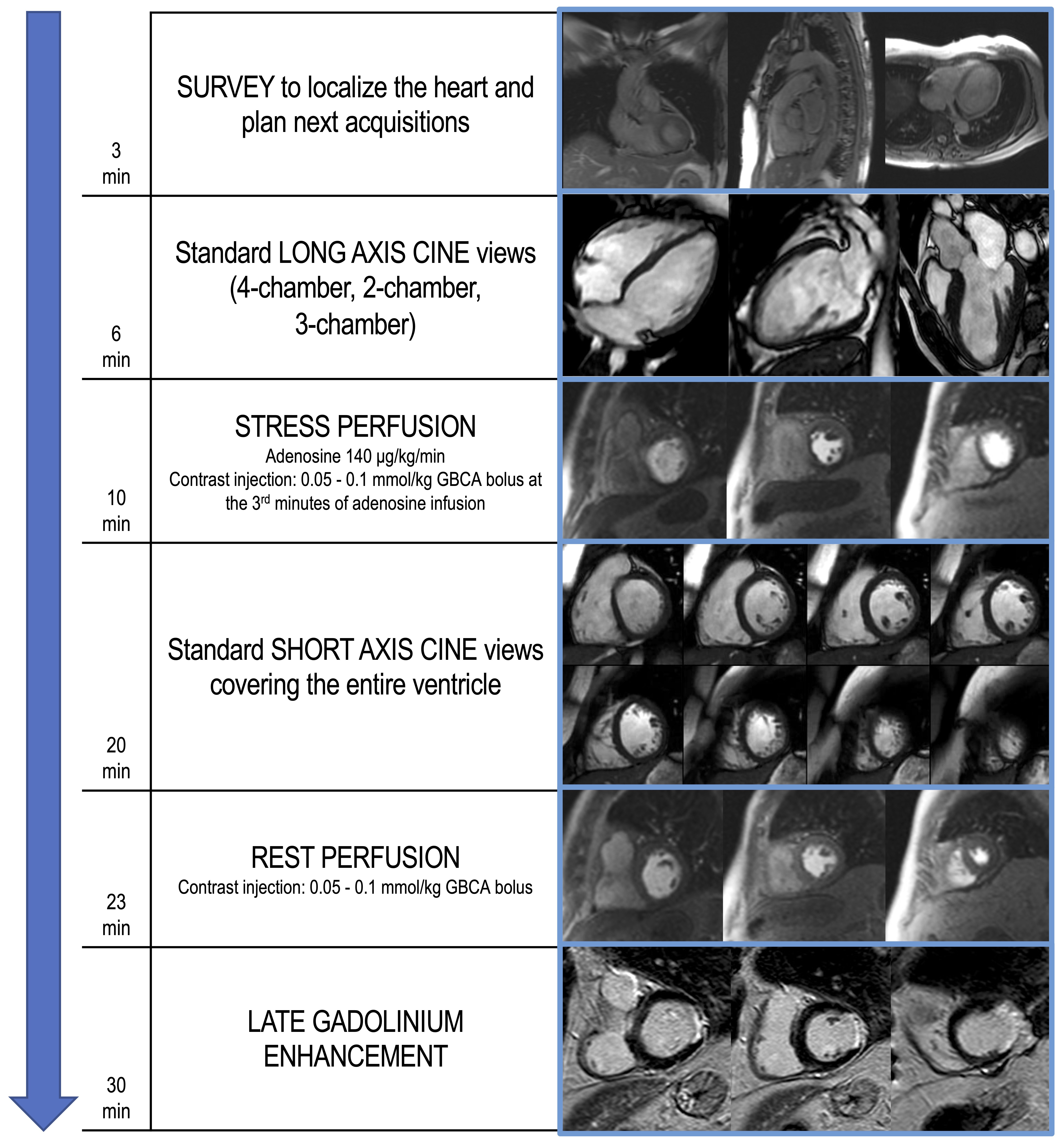Fig. 2.Example of stress CMR protocol with adenosine. The suggested protocol lasts about 30 min and starts with the acquisition of scout images to localize the heart (3 min). Standard long axis cine images are then acquired in 4-chamber, 2-chamber and 3-chamber orientation (6 min). First-pass perfusion images are therefore acquired in three short axis slices, during hyperemic conditions obtained with the administration of a vasoactive agent (i.e., adenosine), to assess for perfusion defects (10 min). Dosage of adenosine and contrast agent infusion are reported. In the following minutes, short axis cine images covering the entire ventricle are performed (20 min). At least 10 min after stress perfusion, rest perfusion images are acquired (23 min). About 5 min after the 2nd GBCA bolus injection, LGE images are performed, investigating the presence of myocardial scars (30 min). CMR, cardiovascular magnetic resonance; GBCA, gadolinium-based contrast agents; LGE, late gadolinium enhancement.
