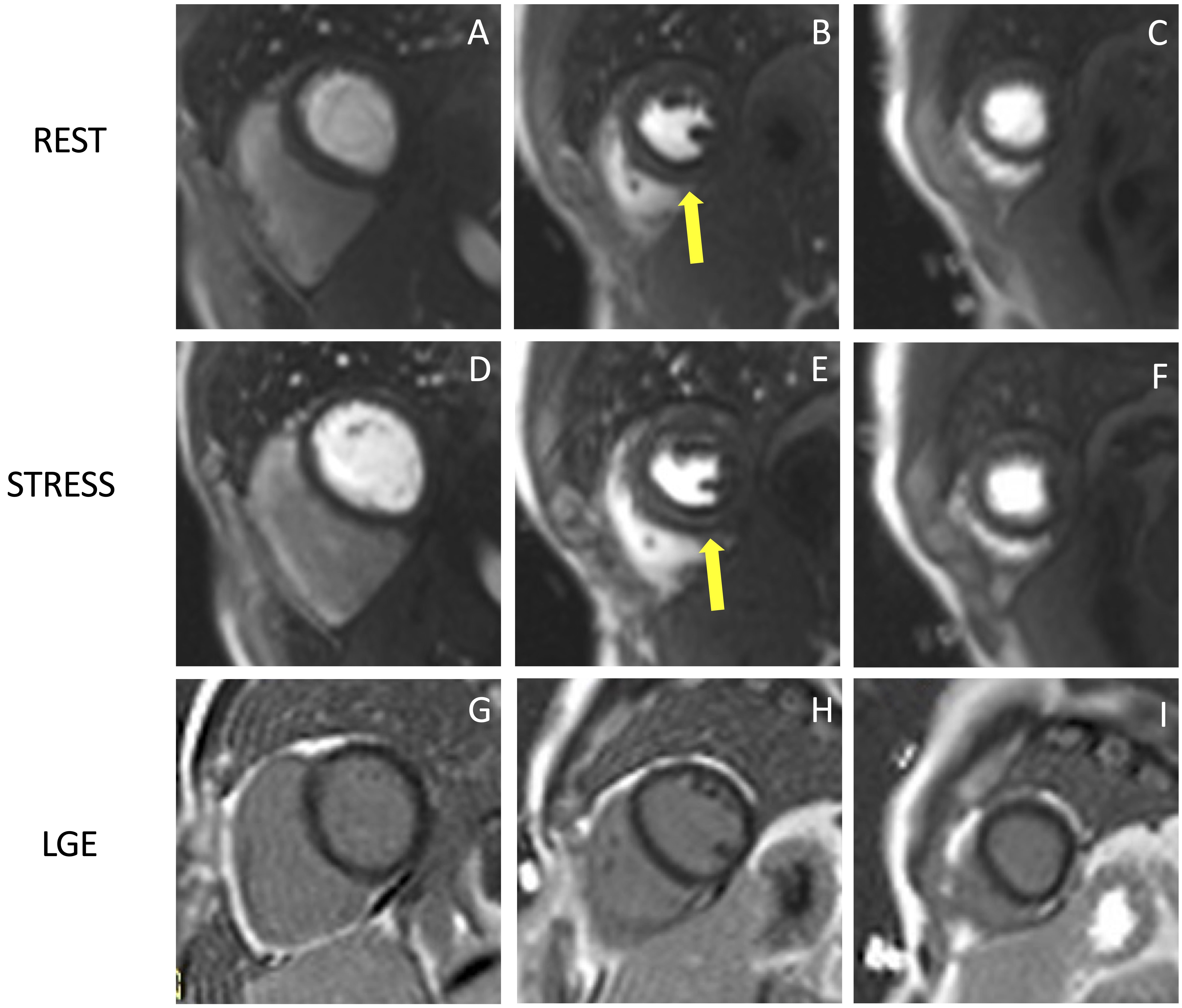 Fig. 3.Example of stress CMR images showing the ‘dark-rim artifact’. CMR adenosine-stress perfusion in a 44-year-old man with a known congenital coronary artery abnormality (RCA with a high take off and inter-arterial course). Short axis rest and stress perfusion images are shown respectively at the basal (A,D), mid-ventricular (B,E), and apical (C,F) levels. There is evidence of a transient hypointense area in the subendocardial layer of the mid-ventricular septal segments (yellow arrows) both in the rest and stress images (B,E), during the early phase of passage of GBCA bolus through the left ventricle, suggestive for “dark rim artifact”. Corresponding LGE images (G,H,I) show no myocardial scars. CMR, cardiovascular magnetic resonance; LGE, late gadolinium enhancement; RCA, right coronary artery; GBCA, gadolinium-based contrast agent.