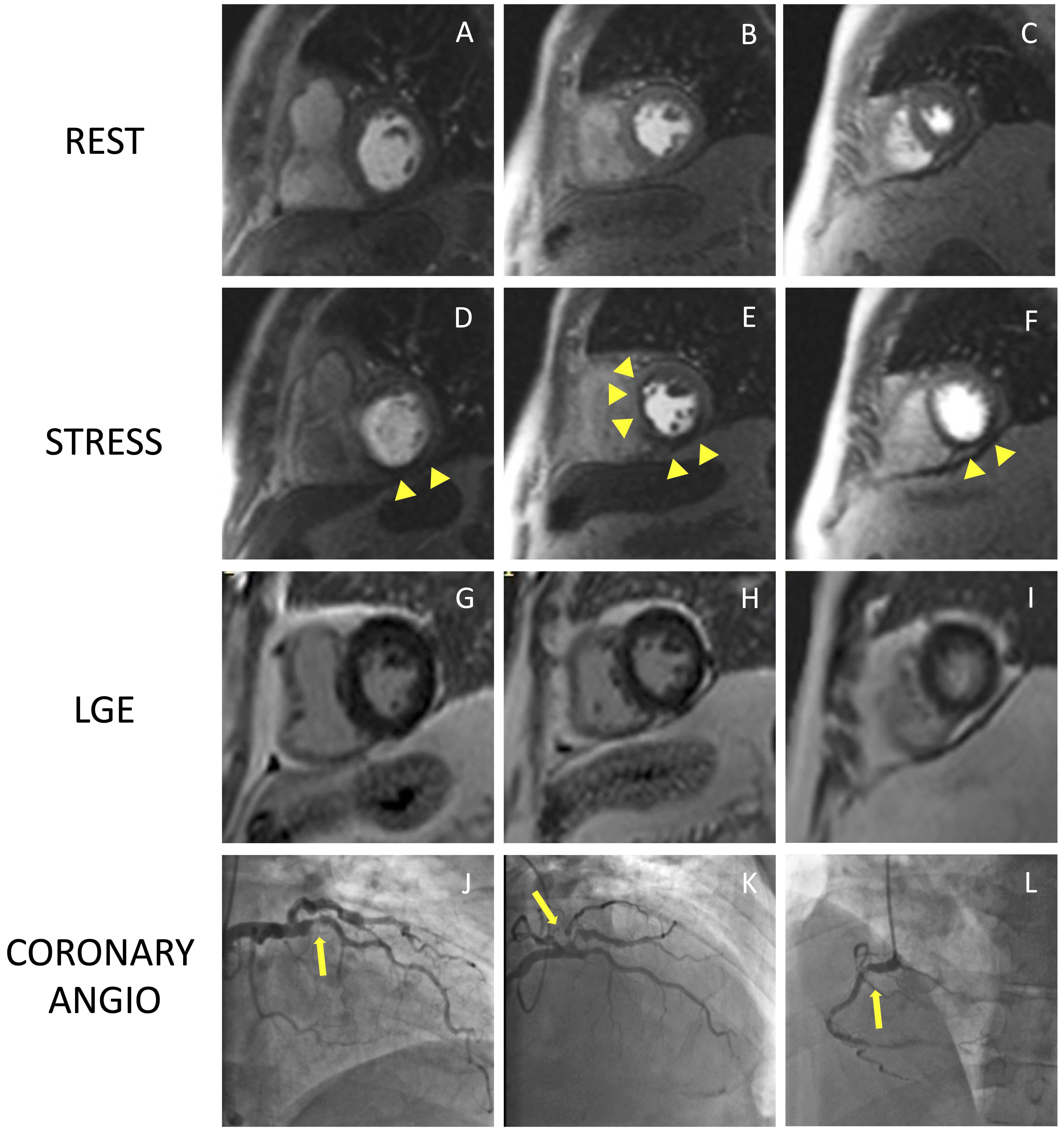 Fig. 4.Example of positive CMR adenosine-stress perfusion. We present the case of a 73-year-old man with new onset of ventricular arrythmia on exercise test and a history of previous ACS and RCA angioplasty. Short axis rest and stress perfusion images are shown respectively at the basal (A,D), mid-ventricular (B,E), and apical (C,F) level. The stress images show the presence of a perfusion defect, appearing as subendocardial hypointense area in the inferior septum, inferior wall and in the mid portion of the anterior and antero-septal walls (yellow arrow heads). Corresponding LGE images (G,H,I) show no myocardial scarring. The patient underwent a coronary angiography which revealed diffuse CAD with severe stenosis at the proximal tract of the LAD artery (yellow arrow line, J). and at the origin of the intermediate and the first diagonal branches (yellow arrow line, K). Moreover, there was an intrastent occlusion in the RCA with a collateral circulation (yellow arrow line, L). CMR, cardiovascular magnetic resonance; ACS, acute coronary syndrome; CAD, coronary artery disease; LAD, left anterior descending; LGE, late gadolinium enhancement; RCA, right coronary artery.