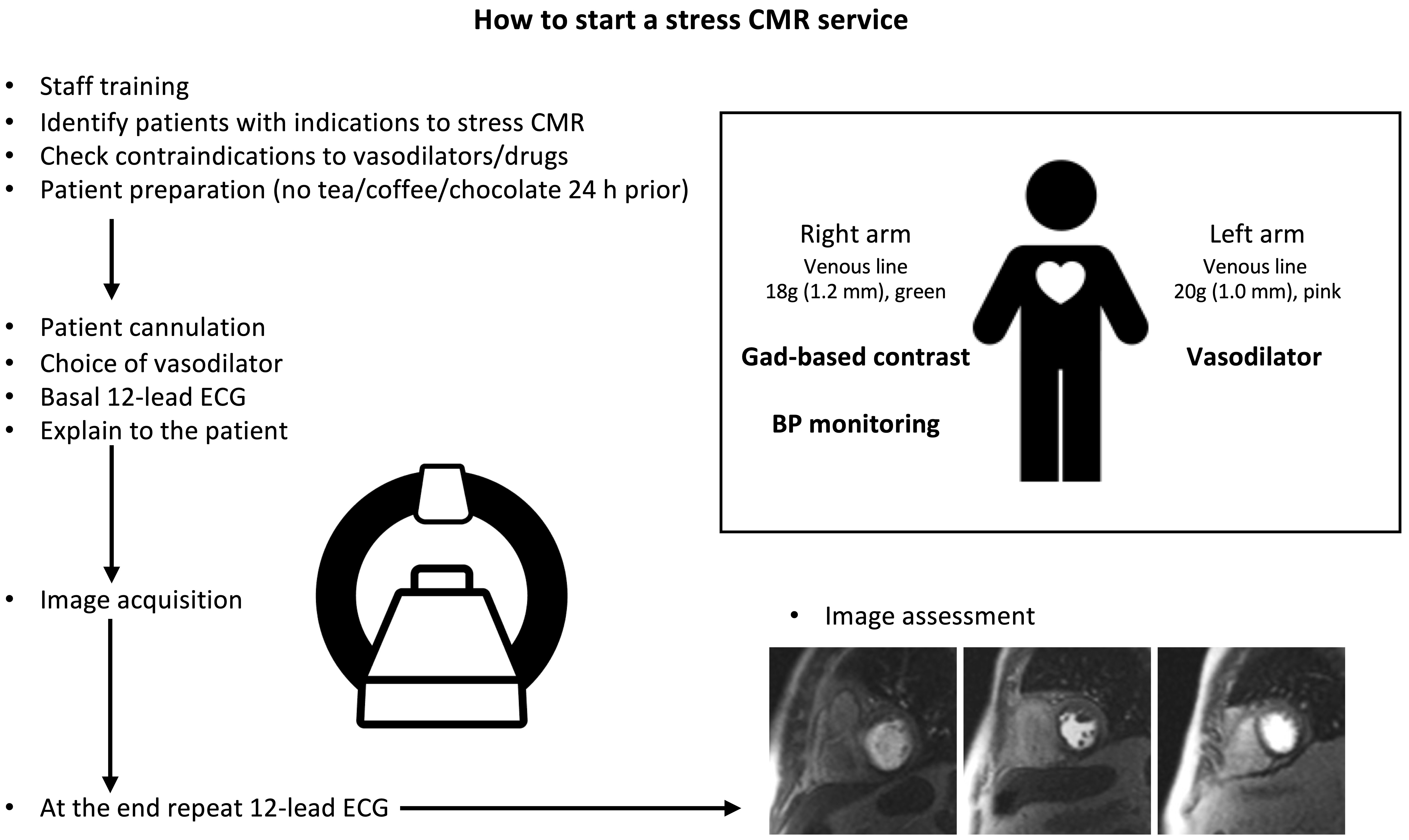 Fig. 6.How to start a stress CMR service. This image shows all the practical steps necessary to implement a stress CMR service in the clinical practice and optimize the workflow. CMR, cardiovascular magnetic resonance; BP, blood pressure; ECG, electrocardiogram; Gad, gadolinium.