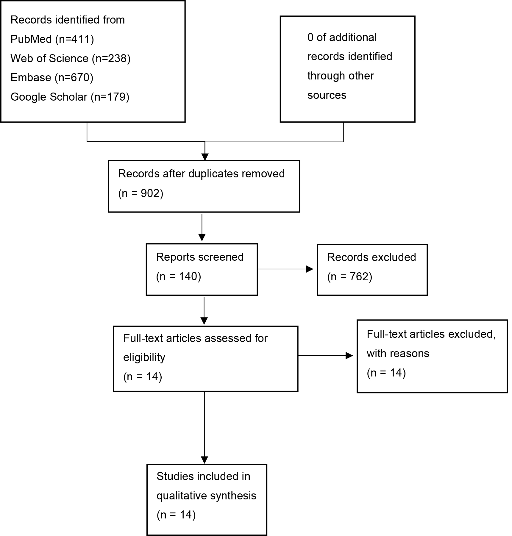 One investigator (ZW) designed and conducted the search strategy using input from the study’s principal investigator (CGX). The literature search process is shown in Fig. 1. From the initial pool of 902 studies, 140 studies were screened based on the assessment of their titles and abstracts. A full-text review was then conducted, resulting in the exclusion of 762 studies. Ultimately, 14 studies were included in the quality assessment and meta-analysis [15, 16, 17, 18, 19, 20, 21, 22, 23, 24, 25, 26, 27, 28].