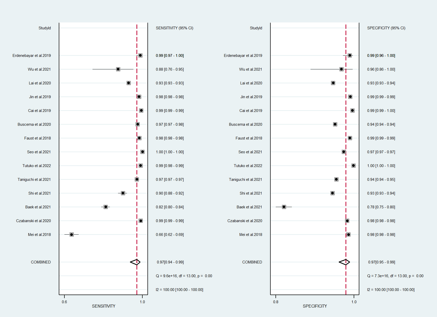 In total, 14 studies were included in the quantitative meta-analysis, and the algorithms had a high performance in the detection of AF in ECGs [15, 16, 17, 18, 19, 20, 21, 22, 23, 24, 25, 26, 27, 28]. The forest plot of meta-analysis revealed high diagnostic performance for AF detection, with a sensitivity of 97% (95% confidence interval [CI]: 0.94–0.99) and a specificity of 97% (95% CI: 0.95–0.99) (Fig. 2).