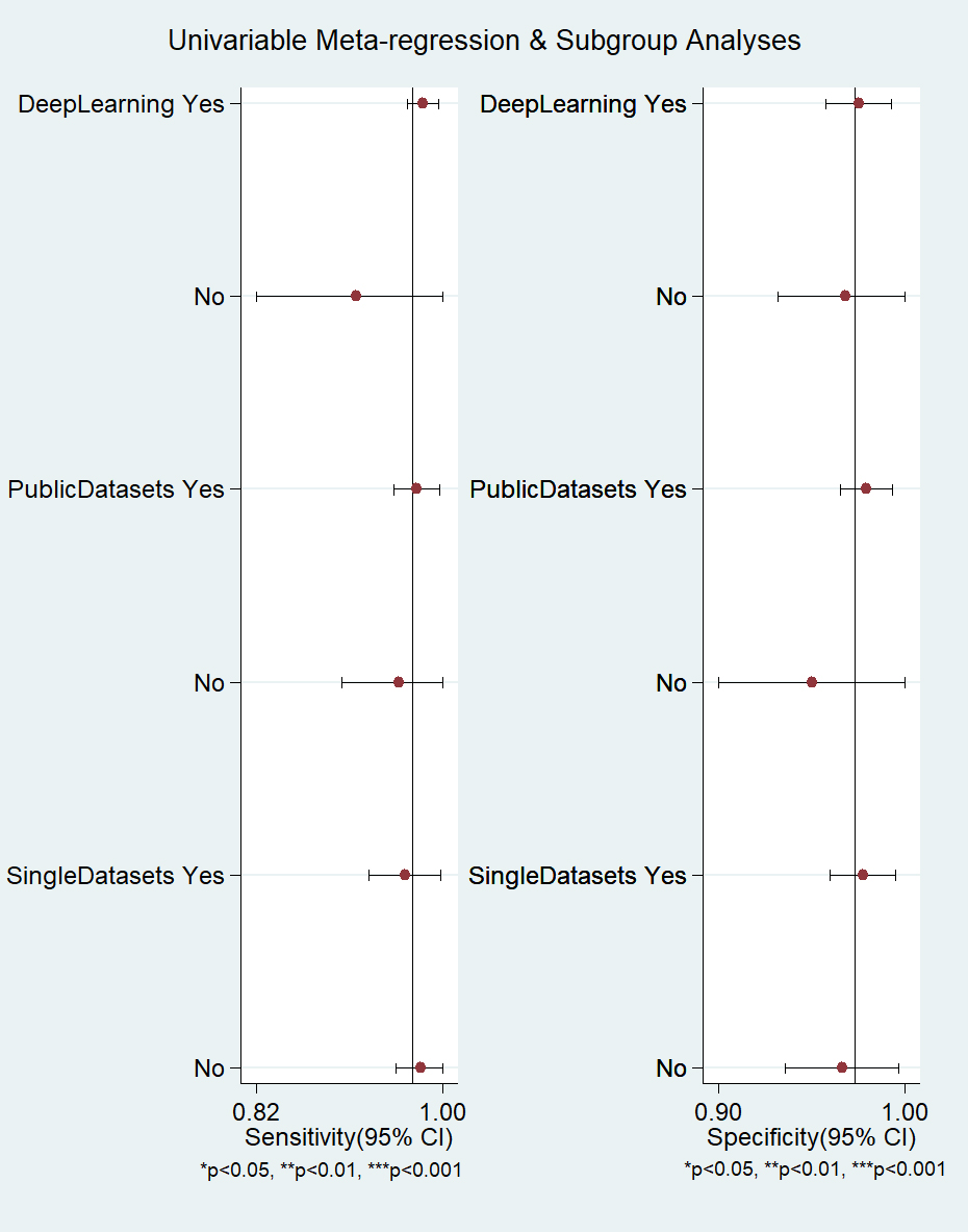 To mitigate the heterogeneity among the studies in the meta-analysis, meta-regression, and subgroup analysis were performed according to the type of algorithm (TML or DL), datasets and their availability (proprietary datasets or public datasets), and the number of used datasets (using a single dataset and multiple datasets).