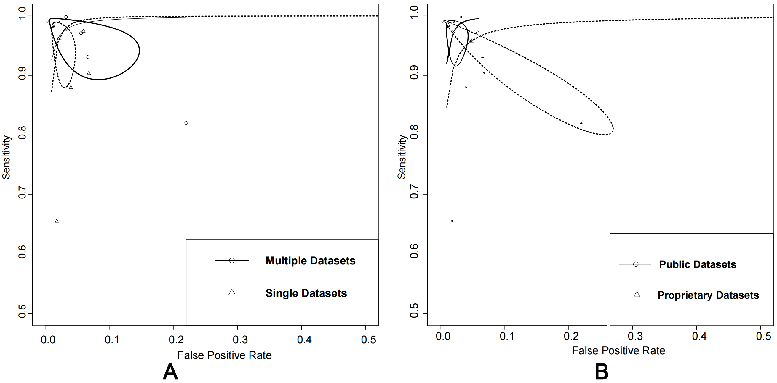 Fig. 6.Comparison: single vs. multiple datasets and public vs. proprietary datasets. (A) Summary of receiver operating characteristics curves of single datasets vs. multiple datasets. (B) Summary of receiver operating characteristics curves of using public datasets alone or in combination with proprietary datasets.