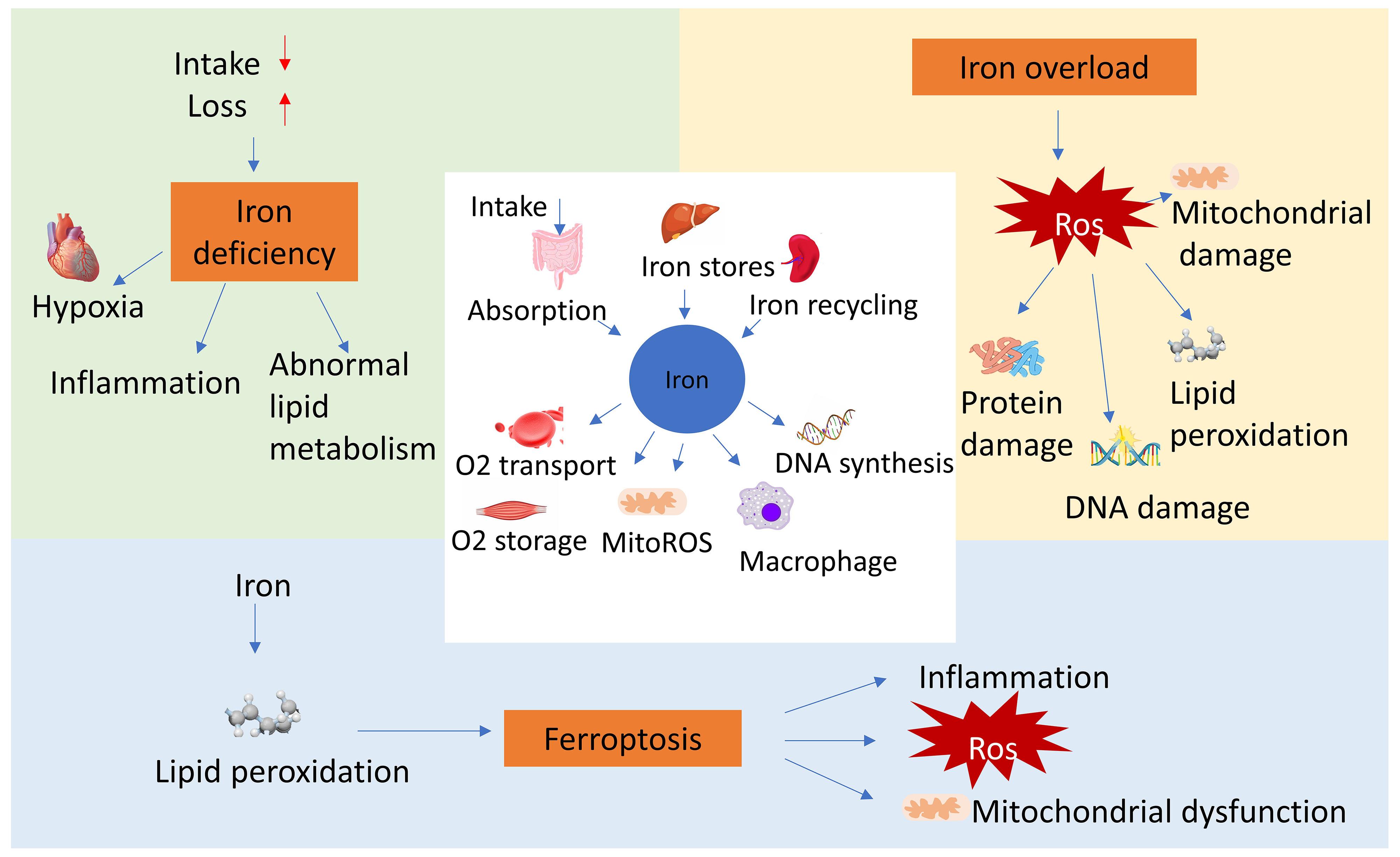 Iron is an indispensable co-factor for many enzymes and important physiological functions, including oxygen transport and deoxyribonucleic acid (DNA) synthesis [1]. Becouse of it’s essential metabolic role, the body has evolved a complex system to regulate iron’s absorption, utilization, storage, and excretion processes [2]. Accumulating evidences suggest that dysregulation of iron metabolism, including both deficiency and overload, are linked to a range of human diseases, including cardiovascular disease (CVD). Iron deficiency typically arises from inadequate dietary intake, and can result in anemia [3]. Conversely, excessive iron accumulation, typically from iron supplementation or chronic blood transfusions, may lead to organ toxicity and CVD [3, 4, 5]. More specifically, excess iron induces inflammation and mitochondrial dysfunction, factors contributing to arterial sclerosis and heart failure (HF) [5]. Recent studies have highlighted the role of ferroptosis, a newly recognized form of programmed cell death, in the pathology and progression of many CVD, including heart disease, drug-induced HF, and arterial sclerosis. Consequently, effective management and treatment of iron metabolism abnormalities offers a viable approach for the prevention and treatment of CVD.