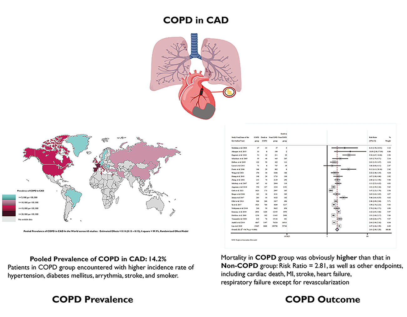Chronic obstructive pulmonary disease (COPD) is a leading cause of death and incidence increases with age [1]. The number of people with chronic respiratory diseases is estimated to be approximately 544.9 million, with almost 55% experiencing COPD [2]. Likewise, coronary artery disease (CAD) is a leading cause of death and consists of common risk factors, including smoking, pollution, unhealthy diet, as well as genetic variances. The coexistence of COPD and CAD is thought to be common and has a hugely detrimental impact on comorbidity outcomes [3]. Indeed, COPD, as a comorbidity of CAD patients, is receiving increased attention, however, there is currently no systematic review or meta-analysis on this growing trend.
