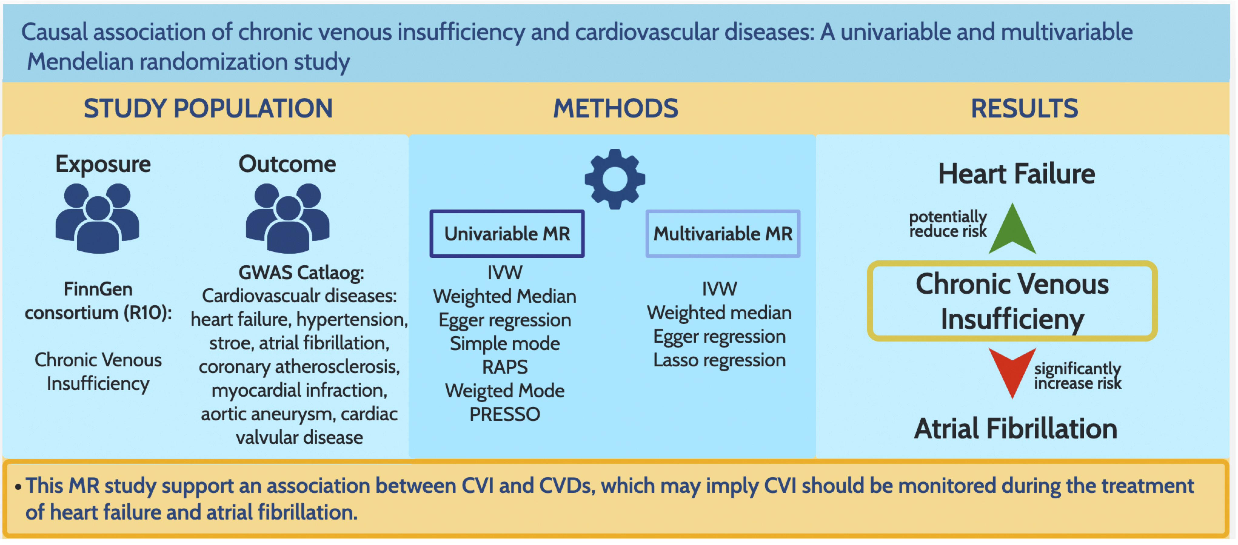 In this study, we systematically investigated potential causal effects between CVI and CVDs using MR analysis. We employed rigorous methods to select instrumental variables, address pleiotropy concerns, and enhance the validity of the MR analysis. Additionally, we utilized different methods to obtain similar results, further reinforcing the credibility of our findings. However, our study has some limitations. Firstly, the predominant representation of individuals with European ancestry in the GWAS statistics raises concerns regarding the generalizability of our findings to other racial or ethnic populations. It is worth noting that MR is a powerful tool for studying differences in cardiovascular disease risk factors across different ethnic groups [2]. Additionally, while we tried to mitigate pleiotropy, it is improbable that all instances will be completely eliminated in Mendelian randomization studies. Thirdly, subgroup analysis is warranted to investigate further and better understand the impact of CVI on CVDs, such as different age and gender groups, especially different Clinical-Etiology-Anatomy-Pathophysiology (CEAP) classifications of CVI groups.