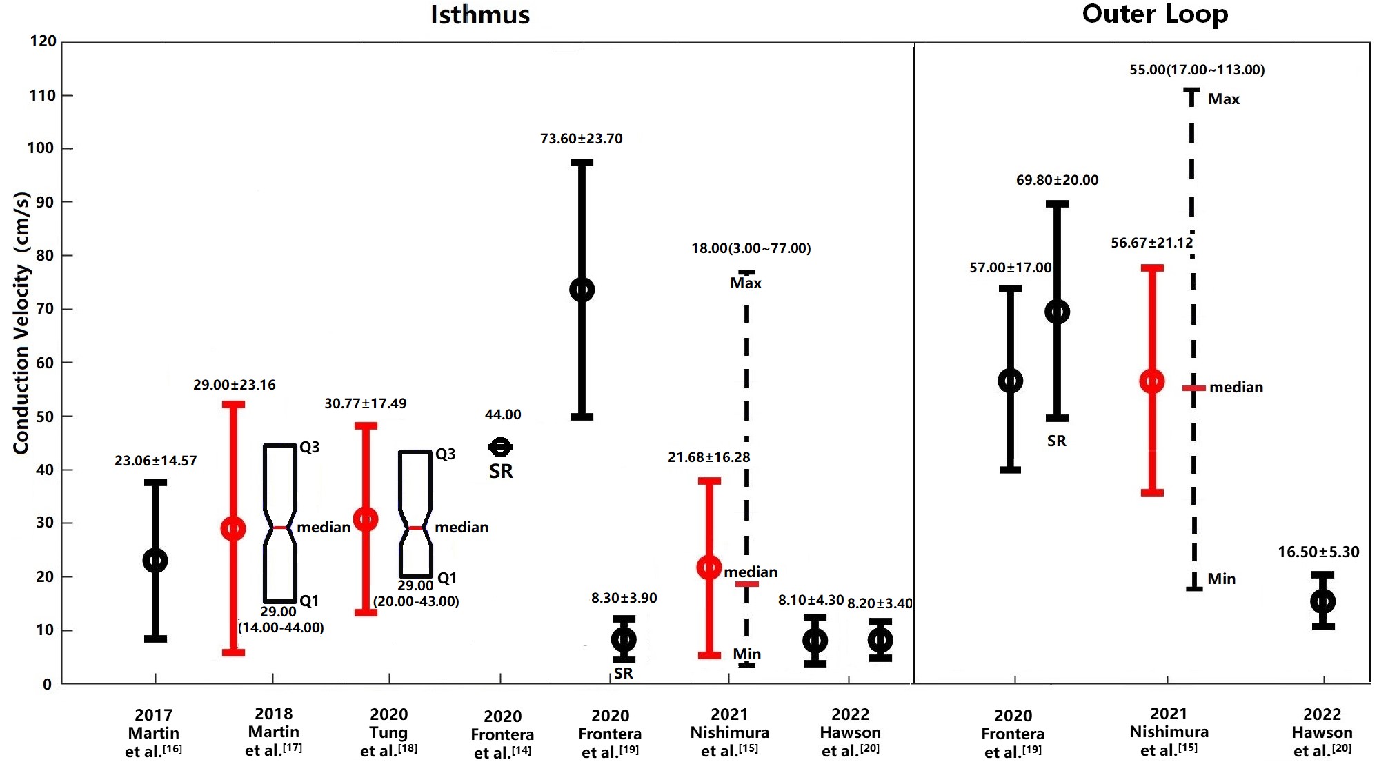 There were significant variations in the longitudinal CV of the human heart between various clinical groups. For example, the CVs reported by Nishimura et al. [15] and Martin et al. [16] showed minimal variation, with means of 21.68 cm/s and 23.06 cm/s, respectively. Similarly, the CVs reported by Martin et al. [17] and Tung et al. [18] were closely matched at 29.0 cm/s and 30.77 cm/s, respectively. Despite some discrepancies among different research groups, there was considerable overlap in the observed ranges of CVs (see Fig. 1). The variation in CV values may be attributed to differences in the infarct tissue characteristics, including the gray zone and scar tissue among patients in different studies. The proportion of scar to LV mass and gray zone to LV mass have been reported to range from 9% to 20% and 4% to 19% respectively [63]. Another possible explanation for the differences is that the CV decrease is directly proportional to the fibrosis density, as observed on late gadolinium enhancement cardiovascular magnetic resonance imaging (LGE-CMR) in patients with ischemic cardiomyopathy (ICM) [64, 65, 66]. Thus, CV measurements in the isthmus and outer loop may vary among patients.