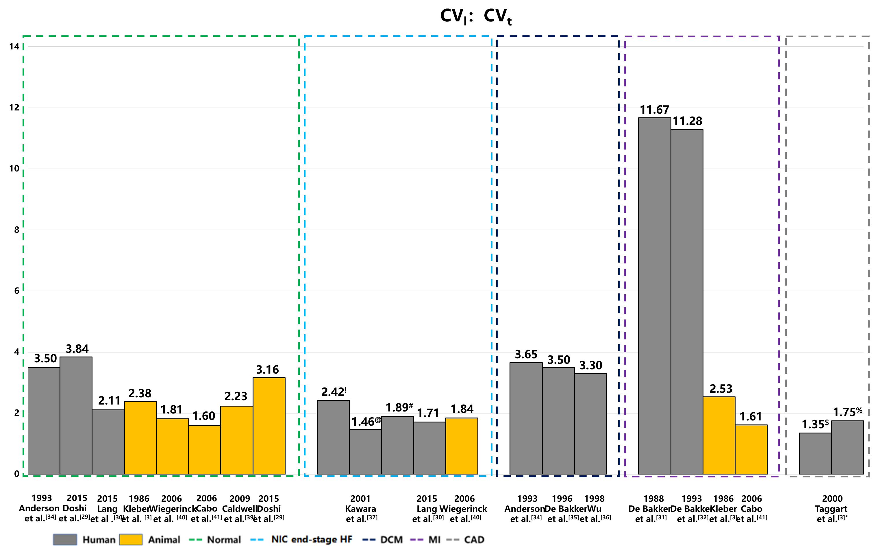 Anisotropic ratios of CV in human and animal hearts under healthy and pathological conditions. This figure illustrates the anisotropic ratios of longitudinal and transverse CVs across a spectrum of heart diseases, including coronary artery disease with MI, hypertrophic cardiomyopathy, and DCM. The data highlights distinct patterns in CV anisotropy corresponding to different types of myocardial fibrosis—patchy, diffuse, and stringy. These visualizations underscore the significant impact of fibrotic remodeling on electrical propagation within the heart. The yellow color represents the CV anisotropic ratio of animal hearts, and the gray color represents human hearts. NIC end-stage HF, nonischemic end-stage heart failure; DCM, dilated cardiomyopathy; MI, myocardial infarction; CAD, coronary artery disease. !: Diffuse fibrosis; @: Patchy fibrosis; #: Stringly fibrosis; $: CAD; %: CAD with early ischemia; CV, conduction velocity; CVt, transverse CV; CVl, longitudinal CV.