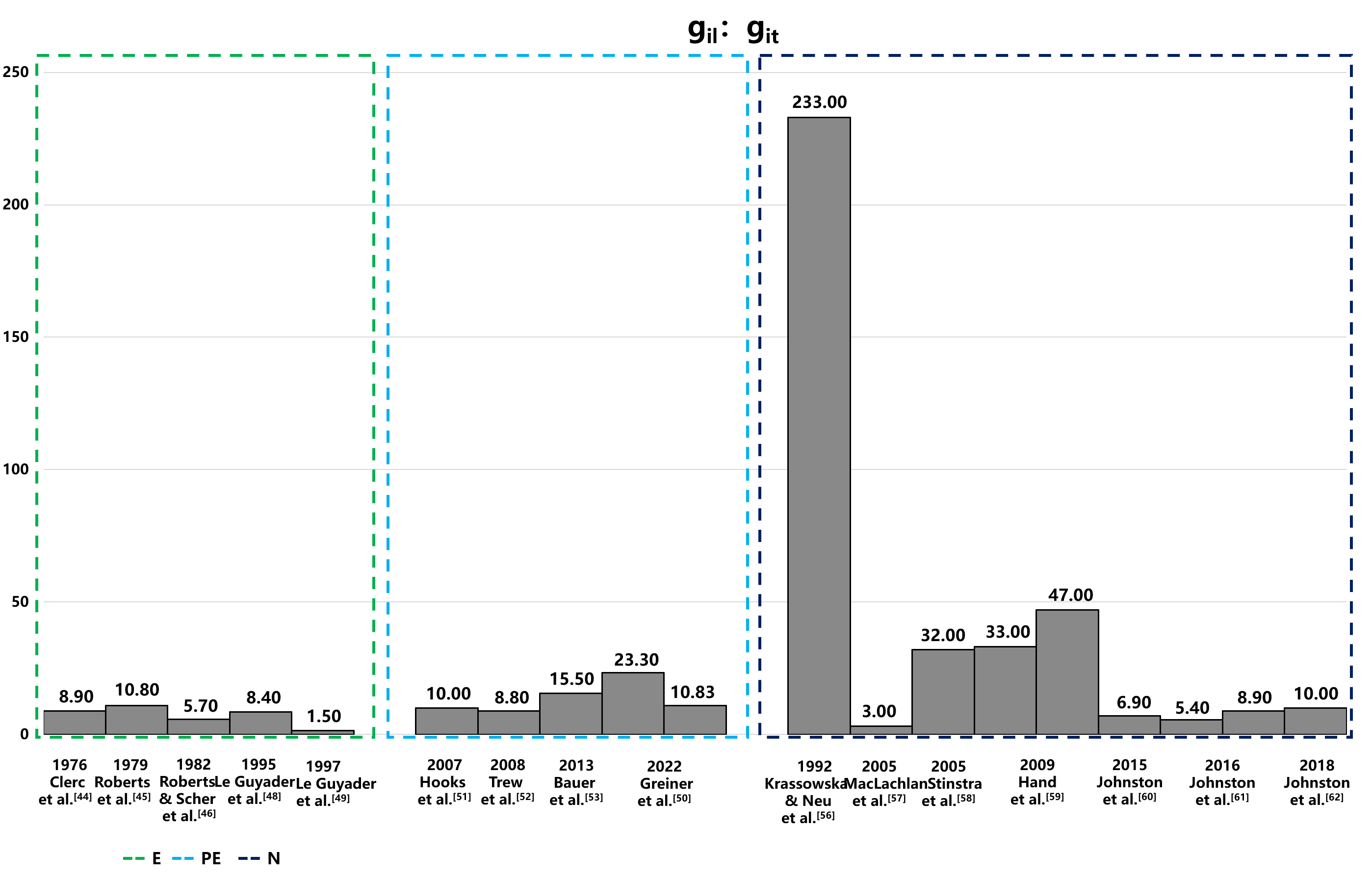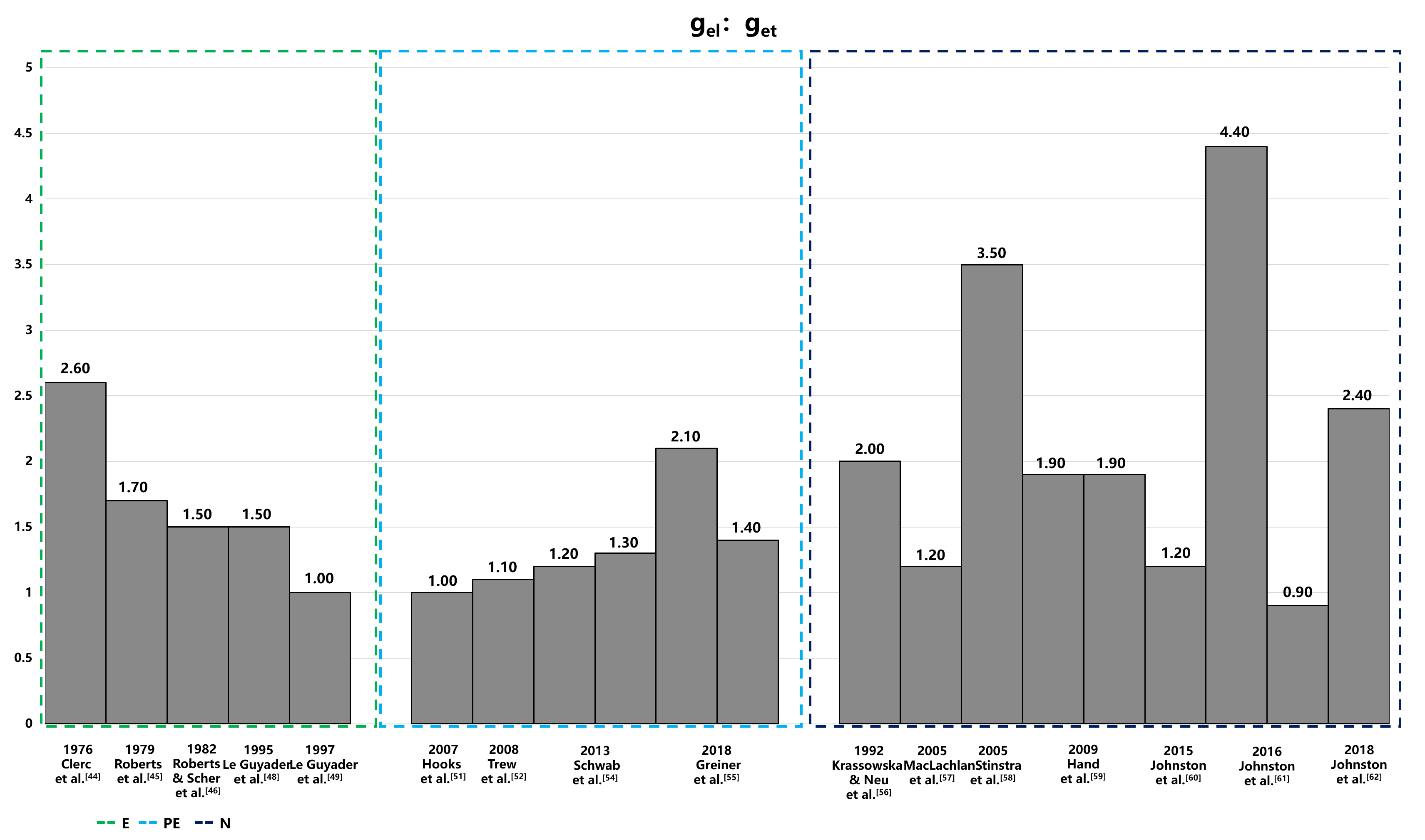 | Year | Study | Method | Tissue type | gil | git | gin | gil: git | gel | get | gen | gel: get |