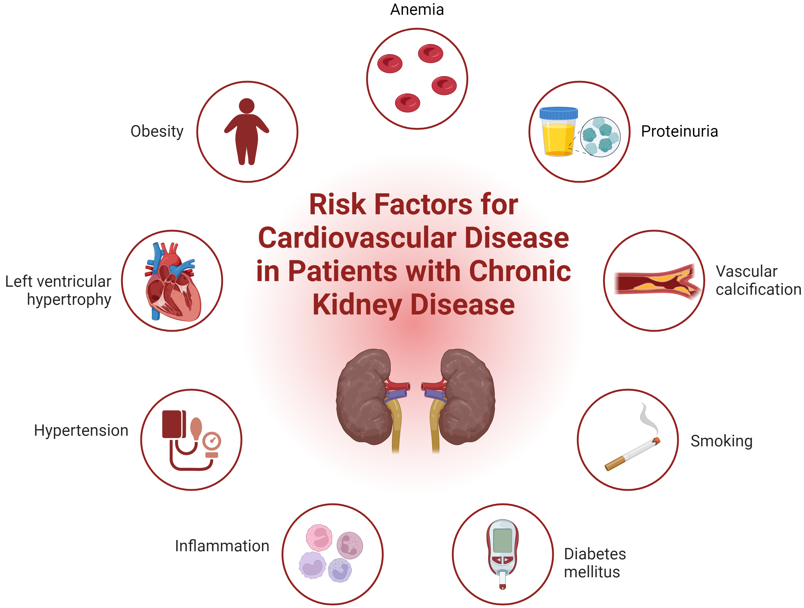 Integrated overview of cardiovascular risk factors in chronic kidney disease. Fig. 1 illustrates both traditional and non-traditional risk factors contributing to cardiovascular disease in patients with chronic kidney disease. Traditional risk factors include hypertension, diabetes mellitus, obesity, dyslipidemia, and smoking. Non-traditional risk factors specific to CKD such as albuminuria, altered bone metabolism, systemic inflammation, anemia, hypervolemia, oxidative stress, left ventricular hypertrophy, and the accumulation of toxic metabolites are also depicted. This comprehensive visualization highlights the complex interplay of factors that exacerbate cardiovascular morbidity in CKD patients. CKD, chronic kidney disease. Created with BioRender.
