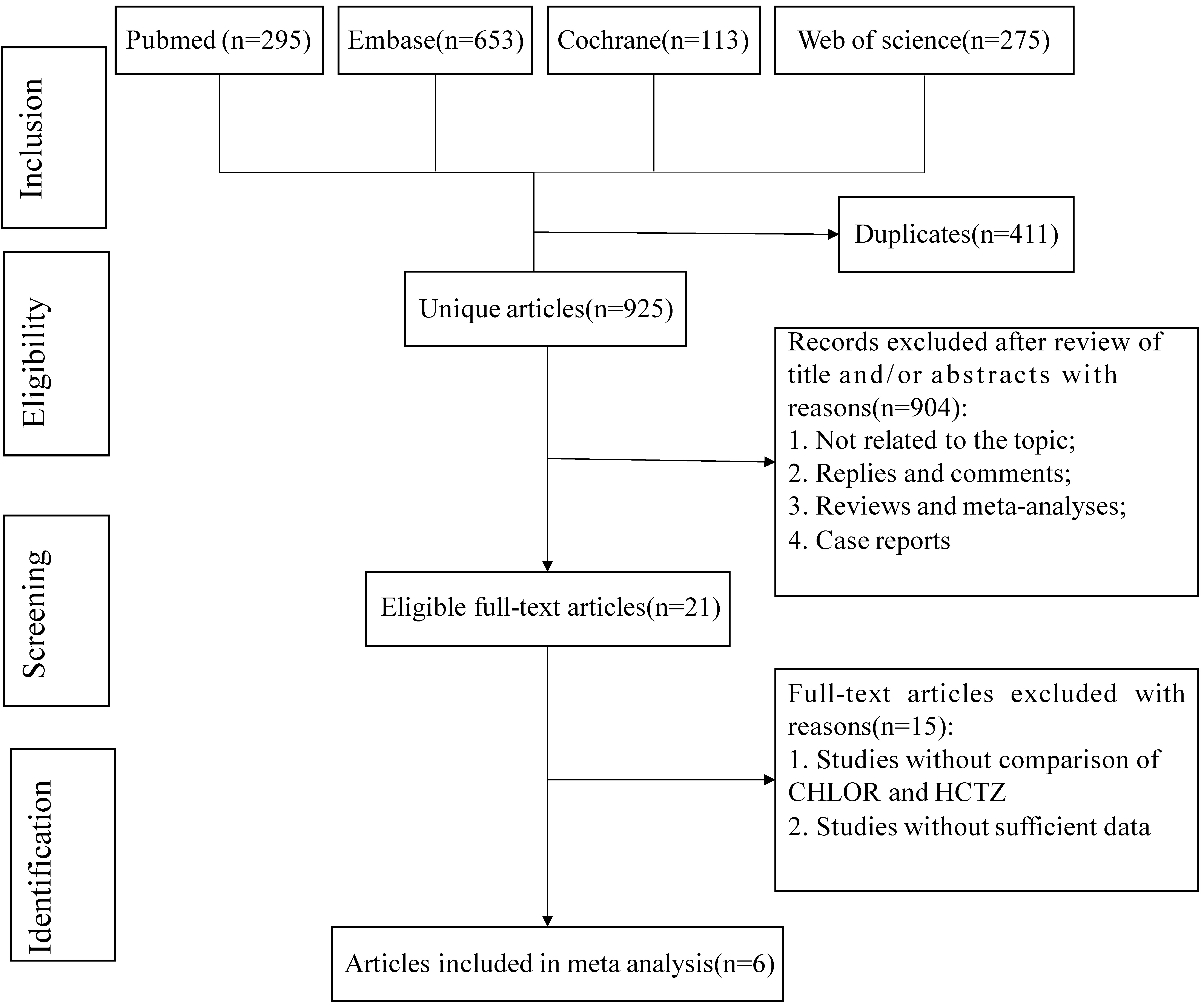 Inclusion criteria were defined as follows: (1) the study design must have been randomized, cohort or case-control; (2) the study enrolled adult participants with diagnosed cardiovascular diseases; (3) the study compared the effectiveness of CHLOR and HCTZ; (4) the study must have reported at least one of the following clinical outcomes: myocardial infarction (MI), heart failure (HF), non-cancer-related death, stroke, death from any cause, hypokalemia, hospitalization for acute kidney injury, or cardiovascular events; and (5) sufficient data was available to allow calculation of a weighted mean difference (WMD) or an odds ratio (OR). This study eliminated non-original articles such as editorial comments, letters, case reports, reviews, pediatric articles, and conference abstracts. Additionally, only published articles were included. Articles written in languages other than English were not considered for inclusion.