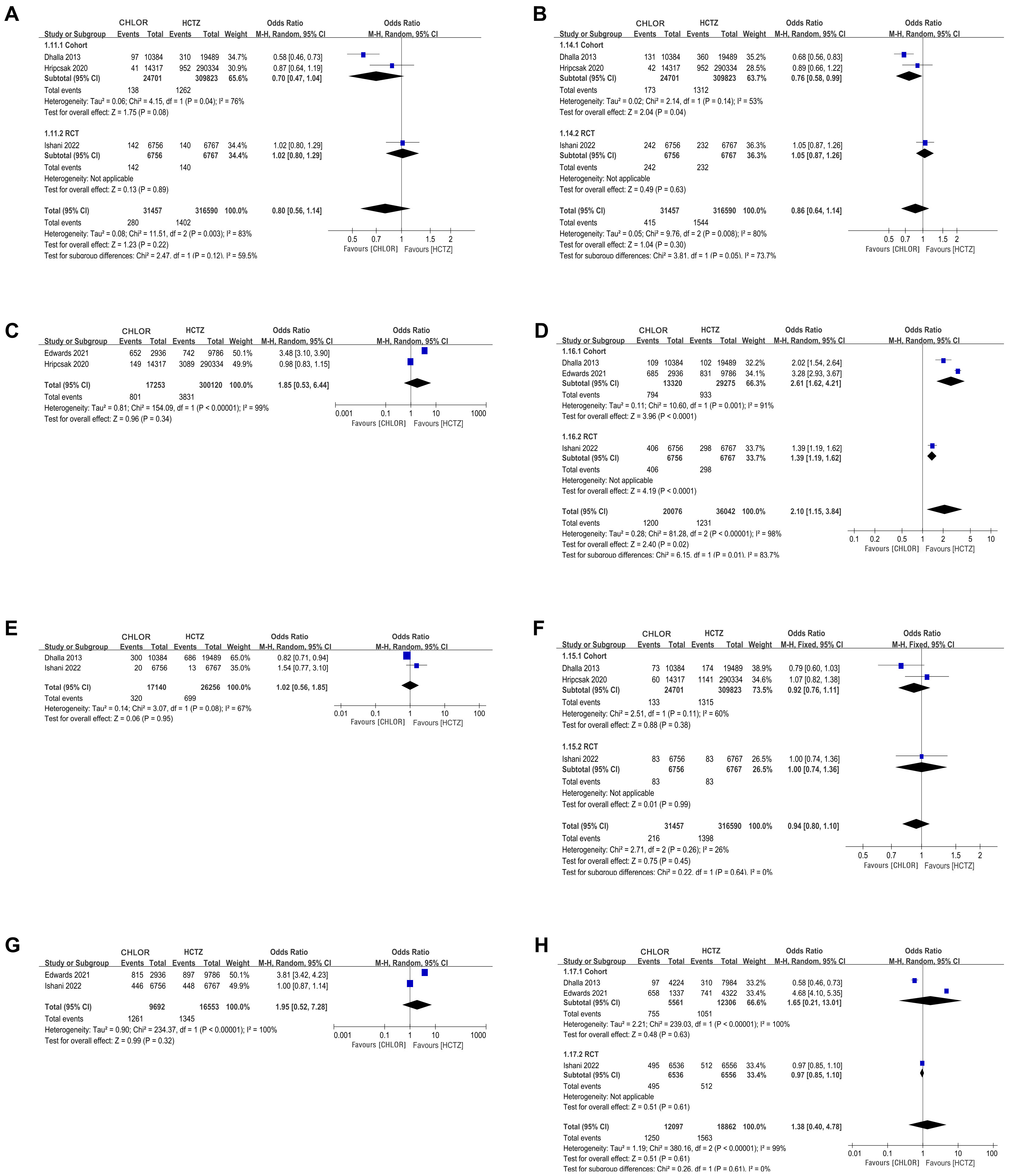 Forest plots of perioperative outcomes. (A) Myocardial infarction. (B) Heart failure. (C) Cardiovascular event. (D) Hypokalemia. (E) Non-cancer-related death. (F) Stroke. (G) Death of any cause. (H) Hospitalization for acute kidney injury. CHLOR, chlorthalidone; HCTZ, hydrochlorothiazide; RCT, randomized controlled trial; M-H, Mantel-hanszel.