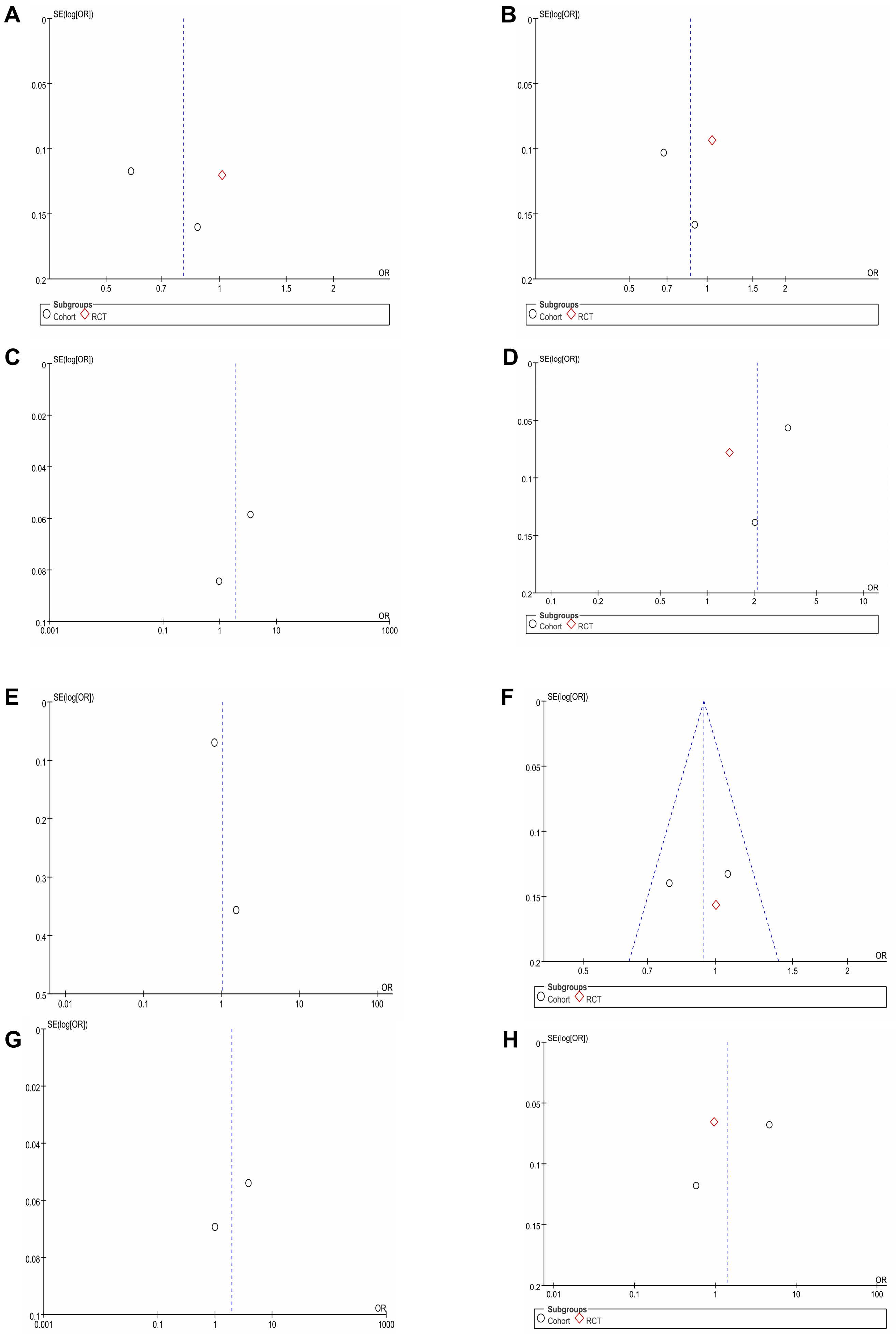 Funnel plots of perioperative outcomes. Funnel plots of (A) Myocardial infarction. (B) Heart failure. (C) Cardiovascular event. (D) Hypokalemia. (E) Non-cancer-related death. (F) Stroke. (G) Death of any cause. (H) Hospitalization for acute kidney injury. RCT, randomized controlled trial.