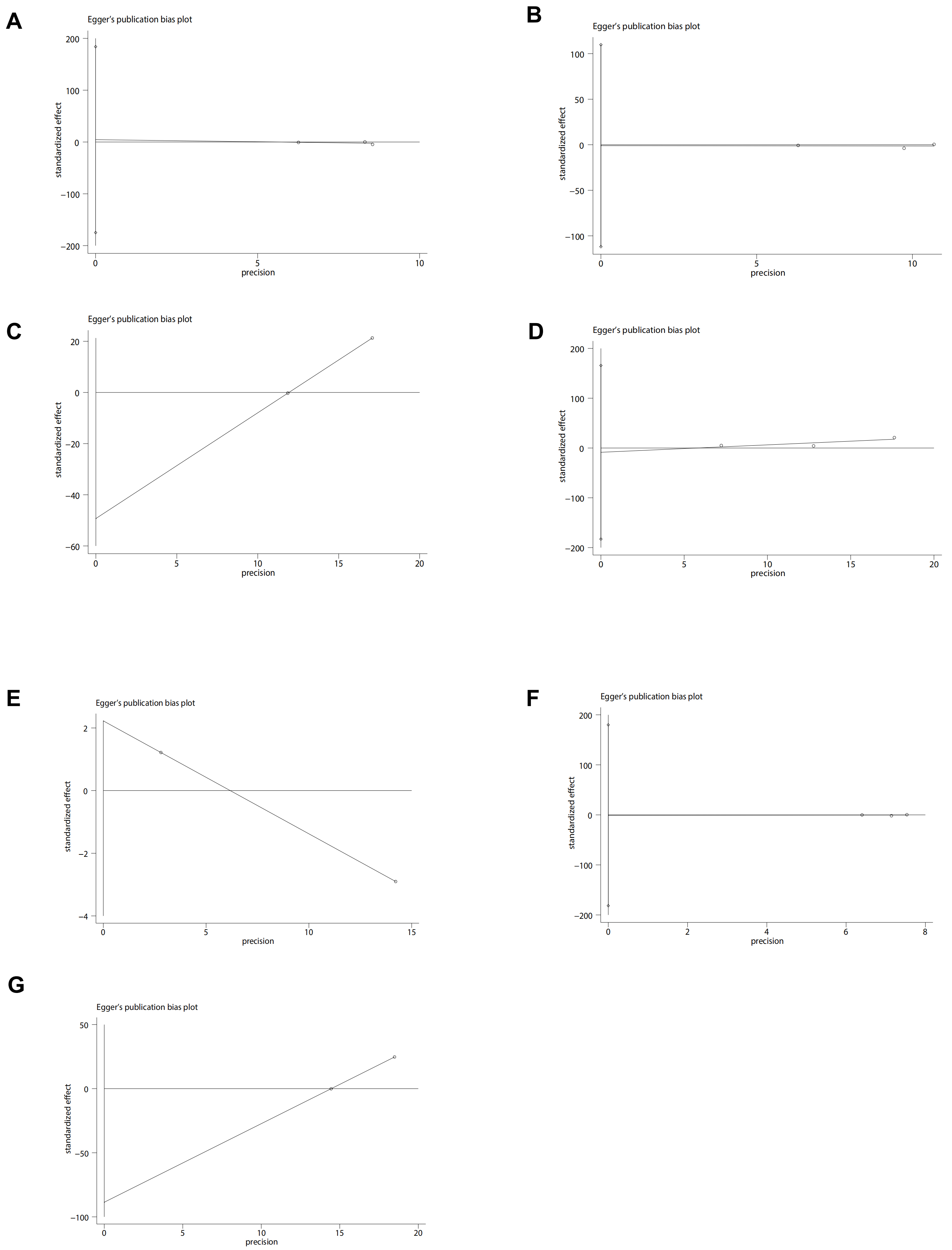 Egger plots of perioperative outcomes. (A) Myocardial infarction. (B) Heart failure. (C) Cardiovascular event. (D) Hypokalemia. (E) Non-cancer-related death. (F) Stroke. (G) Death of any cause.