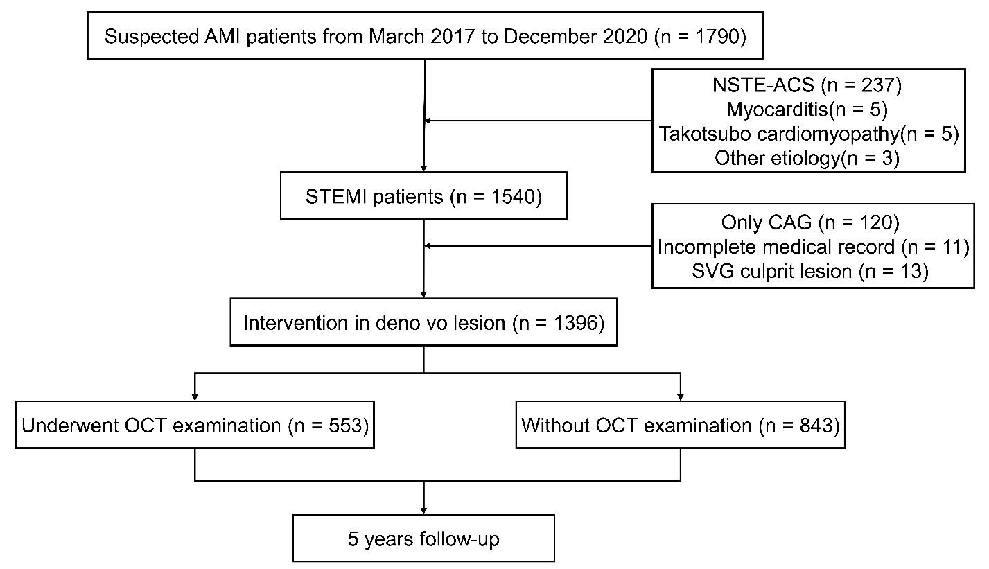 Study flowchart. AMI, acute myocardial infarction; STEMI, ST segment elevation myocardial infarction; NSTE-ACS, non ST segment elevation acute coronary syndrome; CAG, coronary angiography; SVG, saphenous vein graft; OCT, optical coherence tomography.