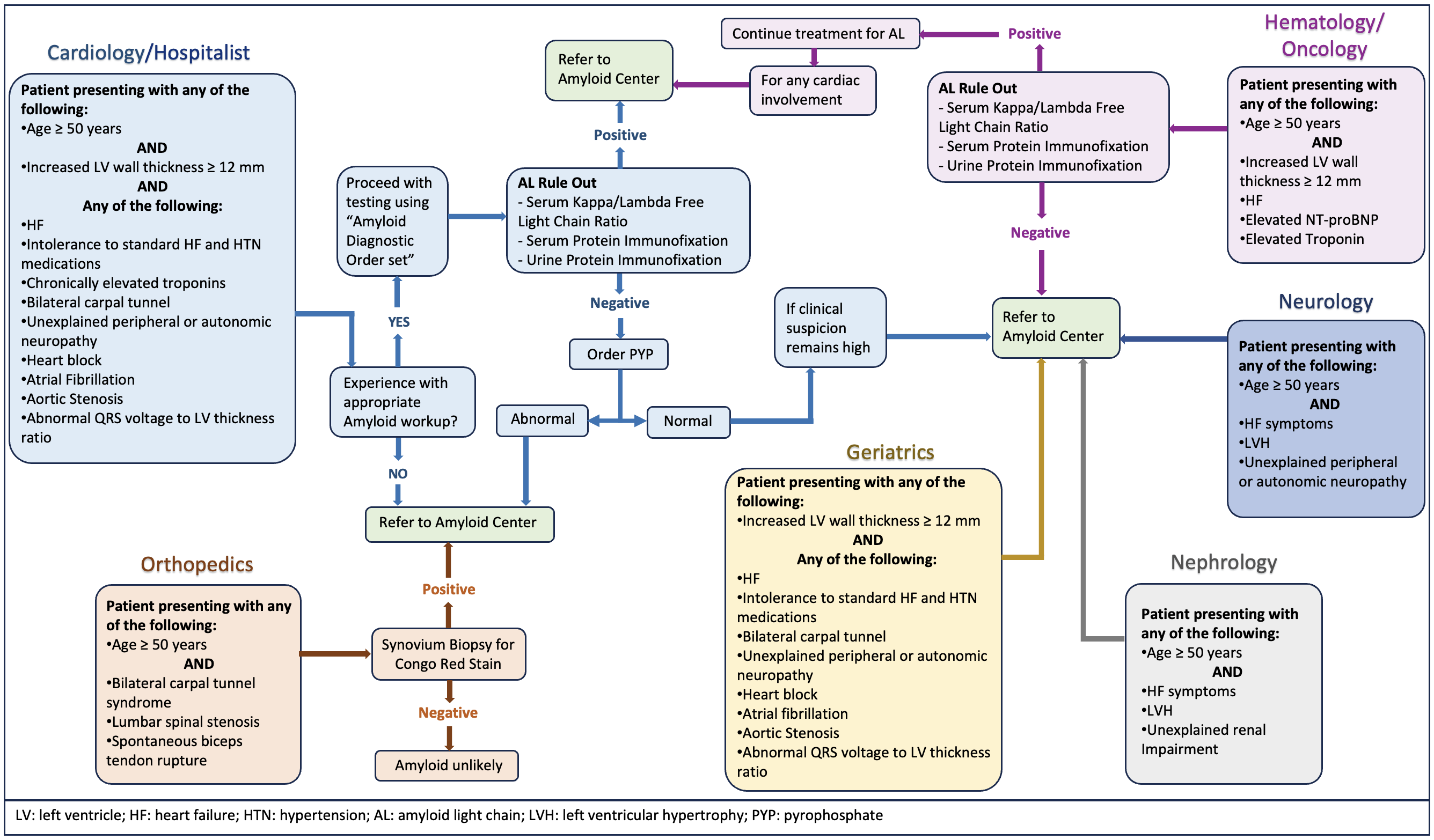 Multidisciplinary collaboration is essential for providing an opportunity for all specialists to collaborate and coordinate in providing expert-level comprehensive care to patients with CA in a single integrated setting. Cardiologists are the primary care providers for patients with ATTR-CA. At the same time, hematologists are often the primary care providers for patients with AL-amyloidosis in collaboration with cardiologists for cardiac involvement. The primary care physician must recognize the signs and symptoms of ATTR-CA and refer patients to a cardiologist for further evaluation. Cardiologists must possess knowledge of clinical presentation and diagnostic clues or red flags of CA and be able to integrate the biopsy and Tc-PYP imaging into the diagnostic algorithm for patients with suspected ATTR-CA after ruling out AL-CA. Nuclear cardiologists must understand and adhere to proper Tc-PYP procedures, standardized testing protocols, and reporting in the hospital. Genetic counselors must provide counseling to the patients and their families and understand genetic testing and screening. Collaboration with gastroenterologists and neurologists is necessary to manage complications from gastrointestinal amyloid deposition, autonomic dysfunction, and polyneuropathy, respectively. Many patients with lumbar spinal stenosis and carpal tunnel syndrome can also develop CA, so orthopedics should also be able to identify patients who are at risk. Nephrologists must be involved as kidney involvement is present in about 70% of patients with amyloidosis, particularly in AL [4, 27]. Multidisciplinary collaboration is also crucial in determining if any systemic involvement contraindicates a heart transplant in cases of advanced heart failure.