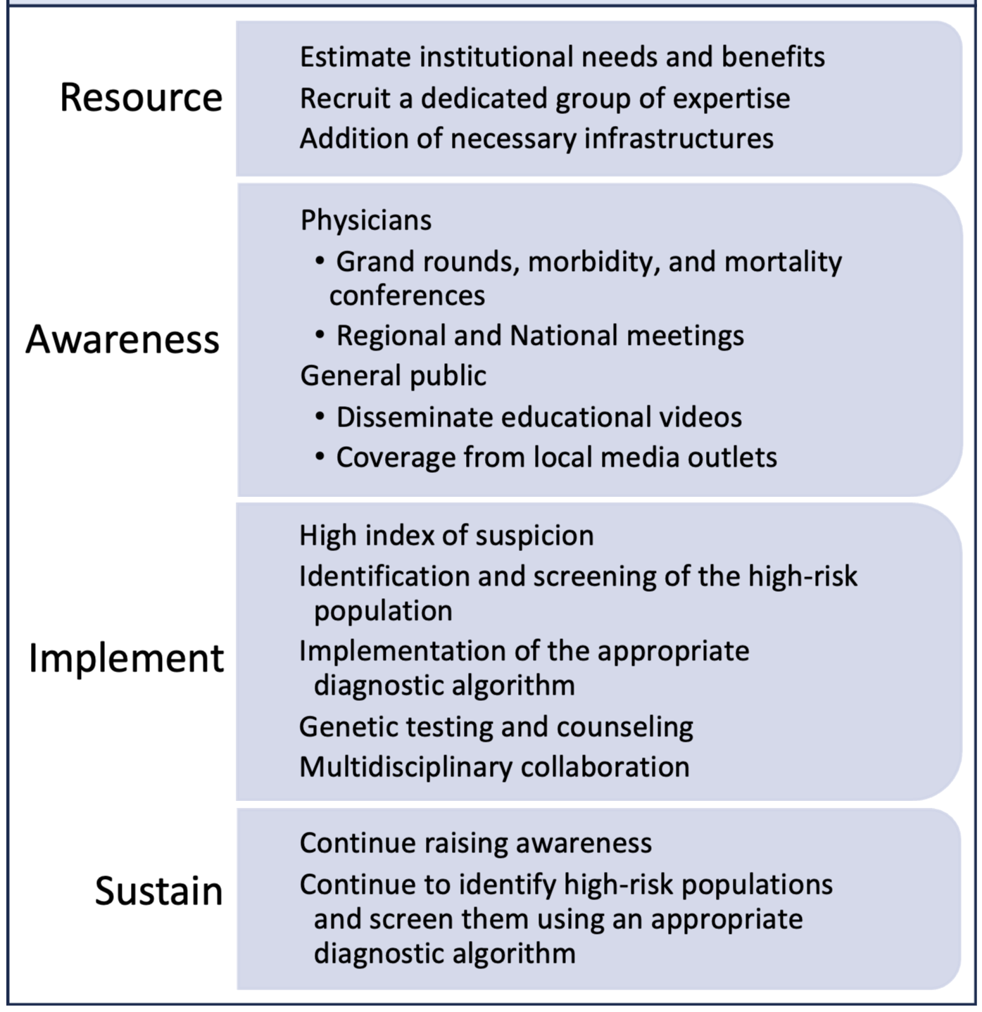 Consistently implementing the above steps is crucial for maintaining the center’s growth after its establishment, elaborated in Fig. 2. Educating community physicians periodically about the disease and its diagnostic clues or red flags will continue to identify high-risk patients and their early referral to the CA center. Educating patients about the condition will increase their likelihood of enrolling in medical care and participating in research. Proper use of the diagnostic algorithm and building an order set in the electronic medical record system to order diagnostic tools easily is imperative. Continuous screening is essential for identifying more patients and thus continues to improve the hospital’s financial burden, allowing for the growth and expansion of the CA center.