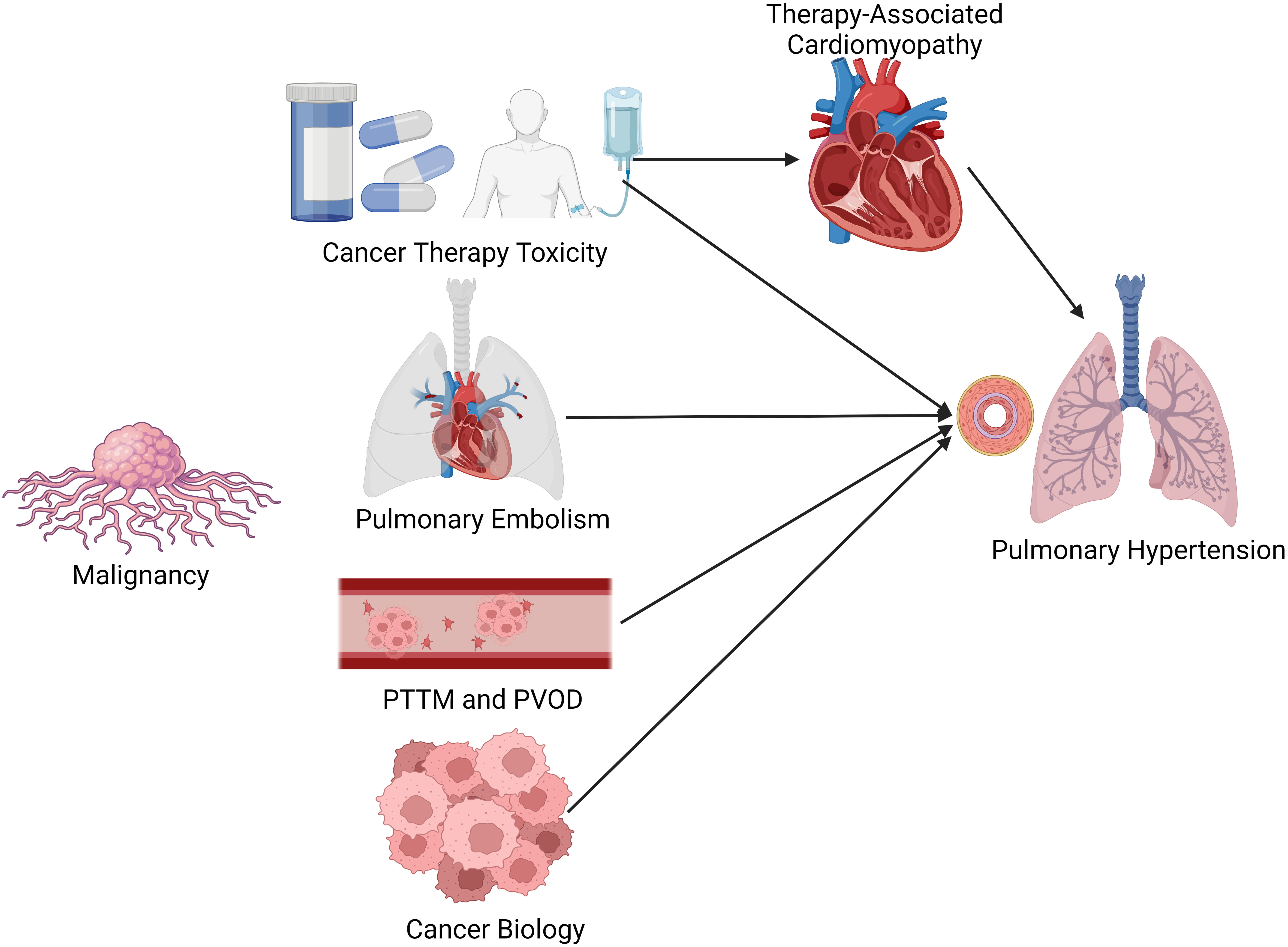 Fig. 1.Potential etiologies of pulmonary hypertension among patients with cancer. Patients with cancer are at risk for developing pulmonary hypertension via several different etiologies including cancer therapy toxicity, hypercoaguability leading to increased risk of pulmonary embolism and tumor biology. PTTM, pulmonary tumor thrombotic microangiopathy; PVOD, pulmonary venous occlusive disease.