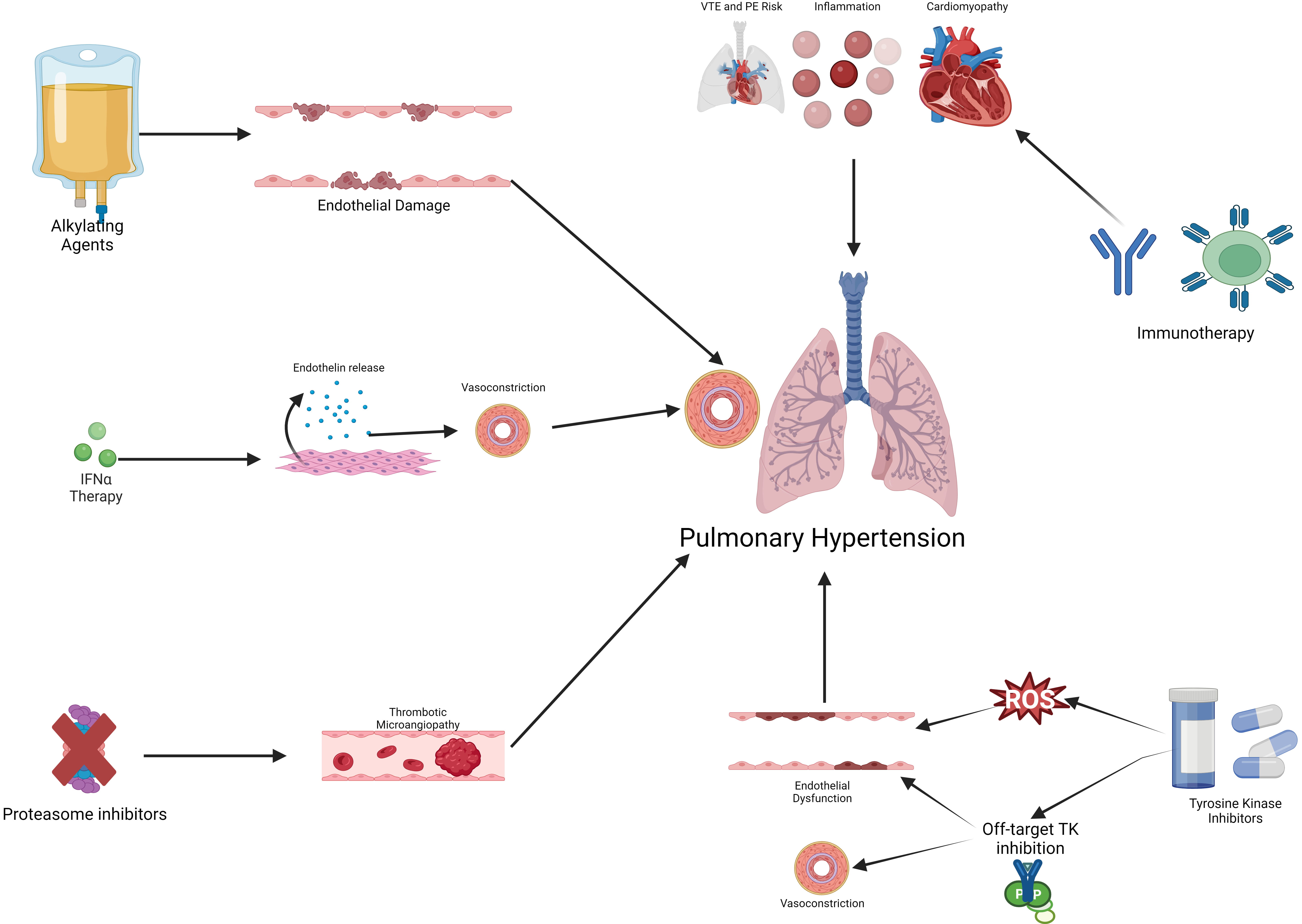 Cancer therapy can cause pulmonary hypertension via several possible mechanisms