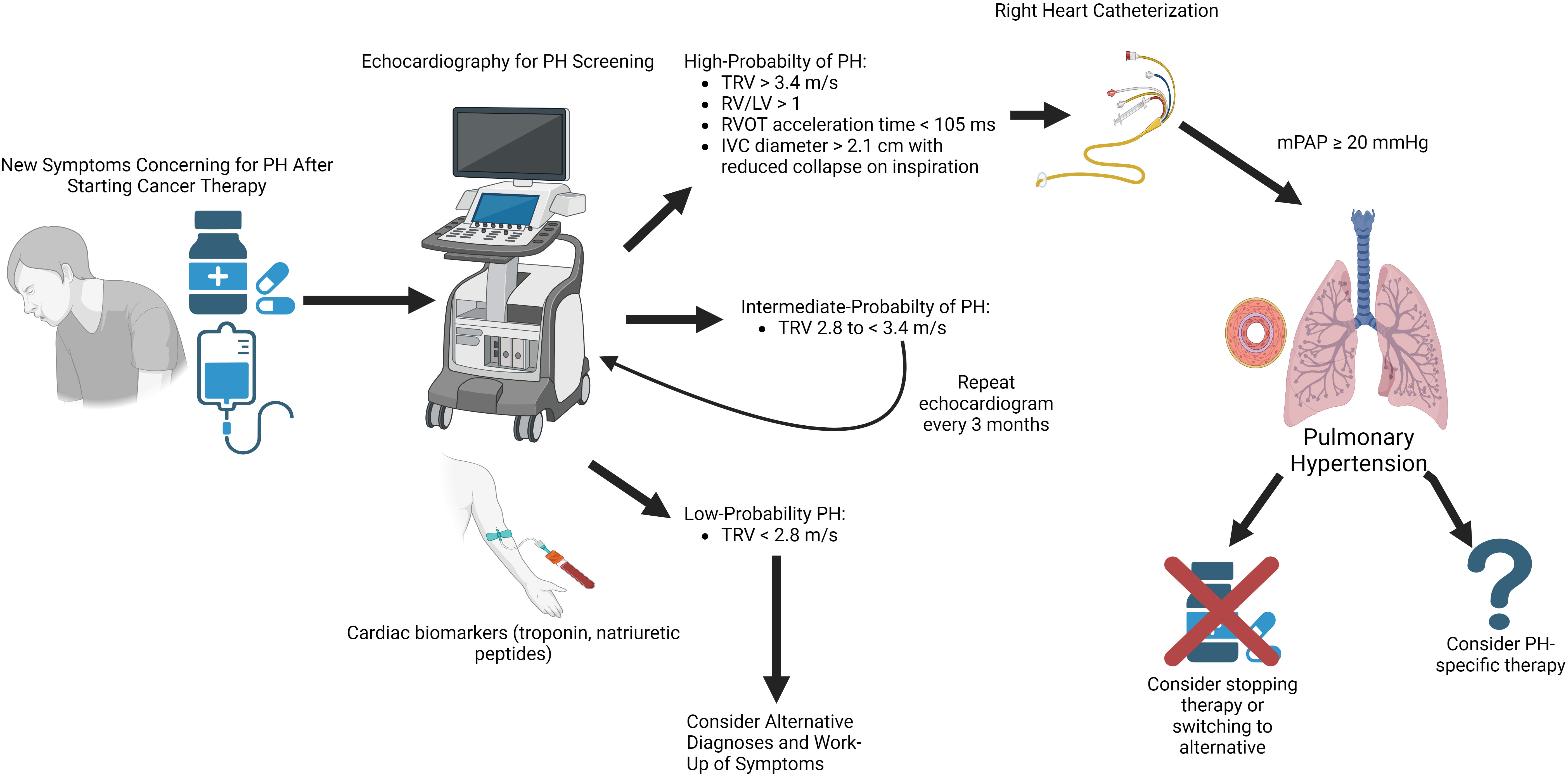 Fig. 3.Proposed algorithm for diagnosis and surveillance of cancer therapy-associated pulmonary hypertension. Symptosm concerning for PH after initiation of cancer therapy should be investigated with blood work and echocardiography. Patients with findings on echocardiography with high-probability of PH should be considered for right heart catheterization for diagnosis of PH. Strong evidence for the safety and efficacy of PH-specific therapy is lacking but can be considered for patients with right heart catheterization-proven PAH. IVC, inferior vena cava; LV, left ventricle; mPAP, mean pulmonary artery pressure; PAH, pulmonary arterial hypertension; PH, pulmonary hypertension; RV, right ventricle; RVOT, right ventricular outflow tract; TRV, tricuspid regurgitation maximum velocity.