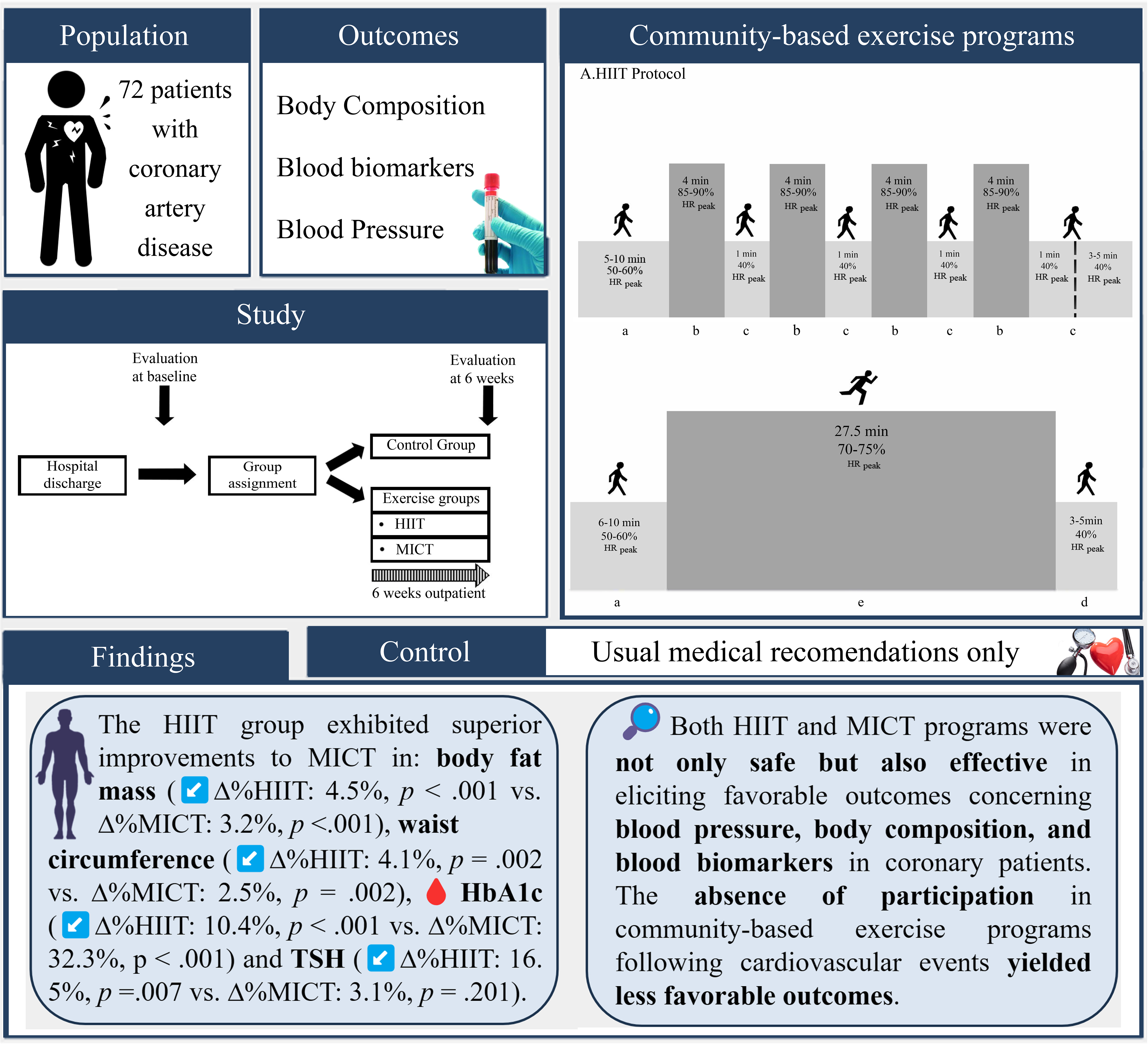 In summary, our randomized controlled study demonstrated that both six-week HIIT and MICT programs were not only safe but also effective in eliciting favorable outcomes concerning blood pressure, body composition, and blood biomarkers in cardiac patients. Particularly noteworthy was the HIIT group’s superior performance compared to the conventional community-based exercise program (MICT), displaying enhancements in SBP, reductions in total body fat mass, abdominal fat percentage, and waist circumference, as well as improvements in lipid profiles, blood glucose levels, and T3 hormone concentrations among patients with CAD. Conversely, the absence of any exercise-based intervention post-cardiac event correlated with adverse outcomes across all clinical variables. Importantly, no adverse events were reported, supporting the inclusion of HIIT as a valuable adjunct or alternative to MICT within community-based exercise programs, positioning it as a significant therapeutic strategy for managing CAD patients.