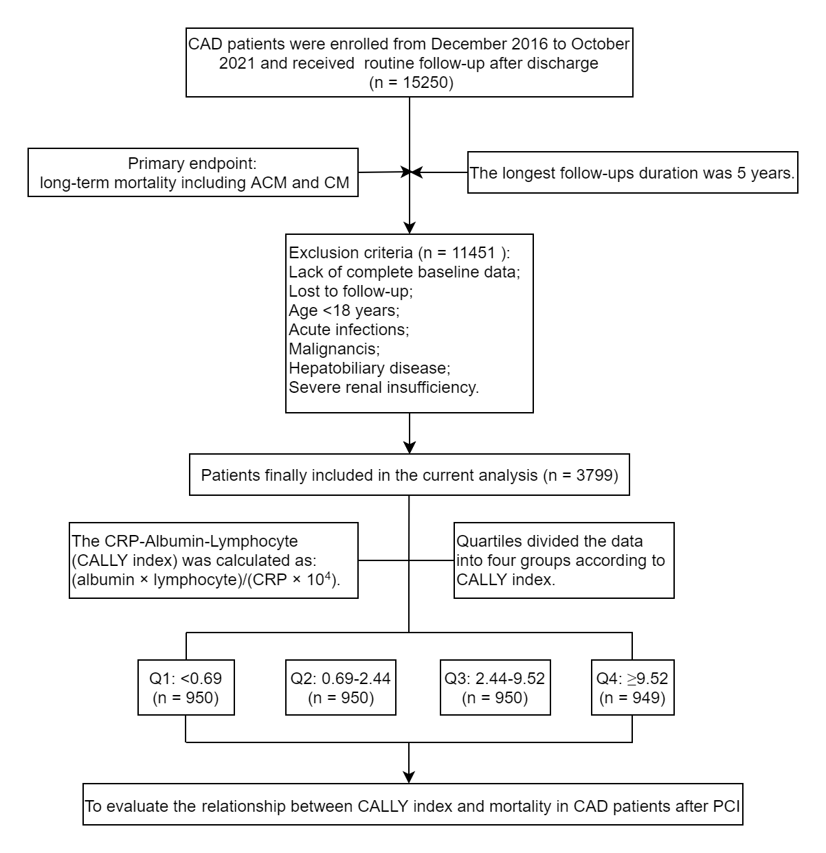Fig. 1.Flowchart of the study. CAD, coronary artery disease; PCI, percutaneous coronary intervention; CALLY, C-reactive protein–albumin–lymphocyte; ACM, all-cause mortality; CM, cardiac mortality; CRP, C-reactive protein.