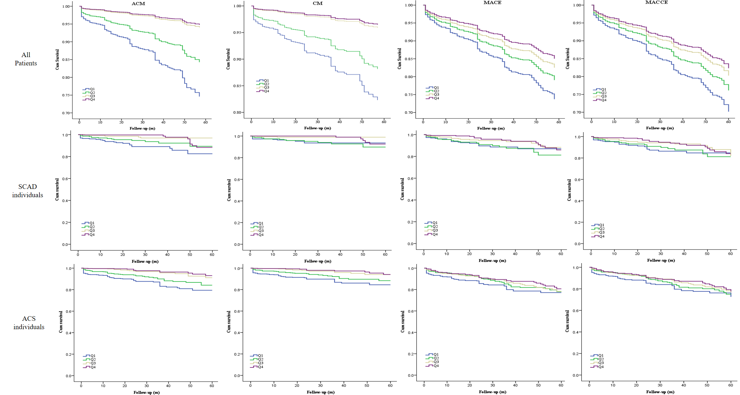 Fig. 2.Cumulative Kaplan–Meier estimates of the time for clinical outcomes to occur in all patients according to the CALLY index quartile. ACM, all-cause mortality; CM, cardiac mortality; MACEs, major adverse cardiovascular events; MACCEs, major adverse cardiac and cerebrovascular events; SCAD, stable coronary artery disease; ACS, acute coronary syndrome; CALLY, C-reactive protein–albumin–lymphocyte.