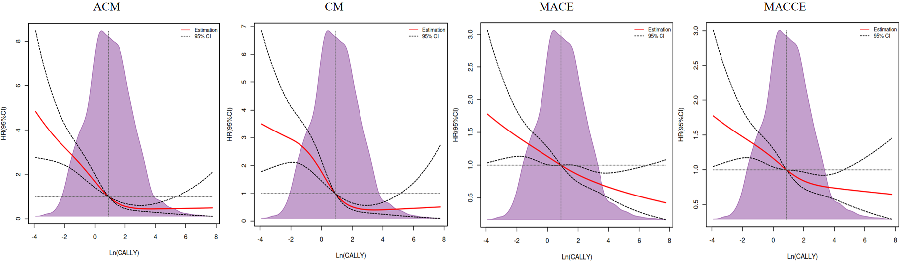 Fig. 3.Restricted cubic spline plots for mortality and ischemic events according to Ln (CALLY) continuous scale. The shaded (light purple color) area represents the percentage of the density distribution in the study population after using the CALLY index. Solid red lines are multivariable-adjusted hazard ratios (HRs), with black dotted ribbons showing 95% confidence intervals (CIs) derived from restricted cubic spline regressions with four knots. The horizontal dotted lines represent an HR of 1.0. ACM, all-cause mortality; CM, cardiac mortality; MACEs, major adverse cardiovascular events; MACCEs, major adverse cardiac and cerebrovascular events; CALLY, C-reactive protein–albumin–lymphocyte.