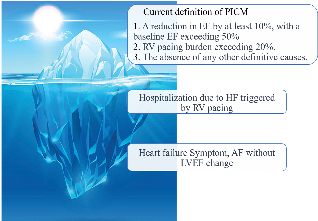 Fig. 1.Definition of pacemaker induced cardiomyopathy. PICM, pacing-induced cardiomyopathy; EF, ejection fraction; RV, right ventricle; HF, heart failure; AF, atrial fibrillation; LVEF, left ventricular ejection fraction.