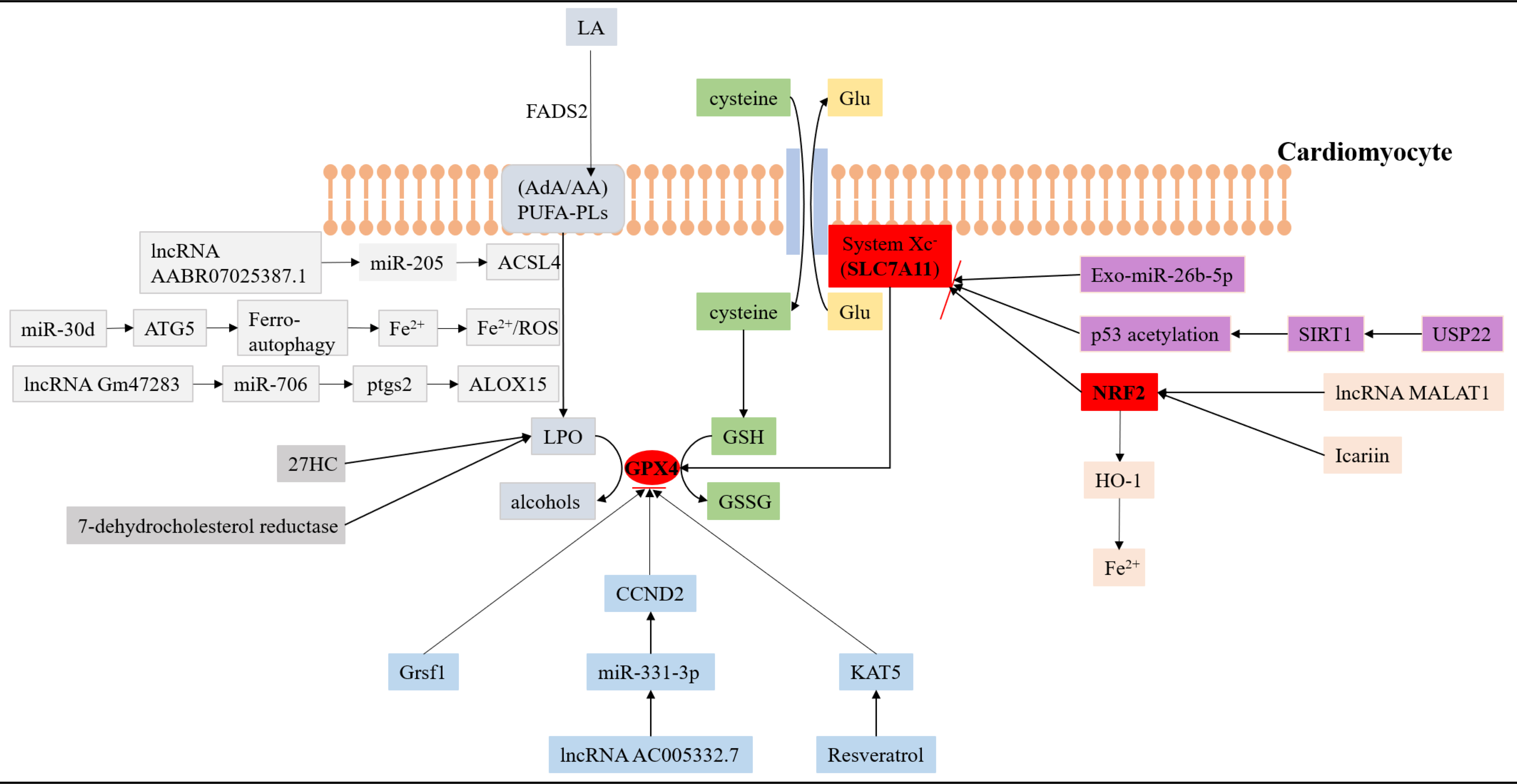 LA, linoleic acid; FADS2, a kind of fatty acid desaturase; AA, arachidonic acid; AdA, Adrenoic acid; PUFA-PLs, phospholipid-containing polyunsaturated fatty acids; LPO, lipid peroxidation; GPX4, glutathione peroxidase 4; ACSL4, acyl-CoA synthetase long-chain family member 4; GSH, glutathione; ATG5, autophagy-related gene 5; Grsf1, a mitochondrial RNA-binding protein; CCND2, cyclin D2; 27HC, 27-hydroxycholesterol; USP22, ubiquitin-specific peptidase 22; SIRT1, sirtuin-1; NRF2, nuclear factor-erythroid factor 2-related factor 2; HO-1, heme oxygenase 1. ALOX15, lipoxygenase 15; Ptgs2, prostaglandin-endoperoxide synthase 2.