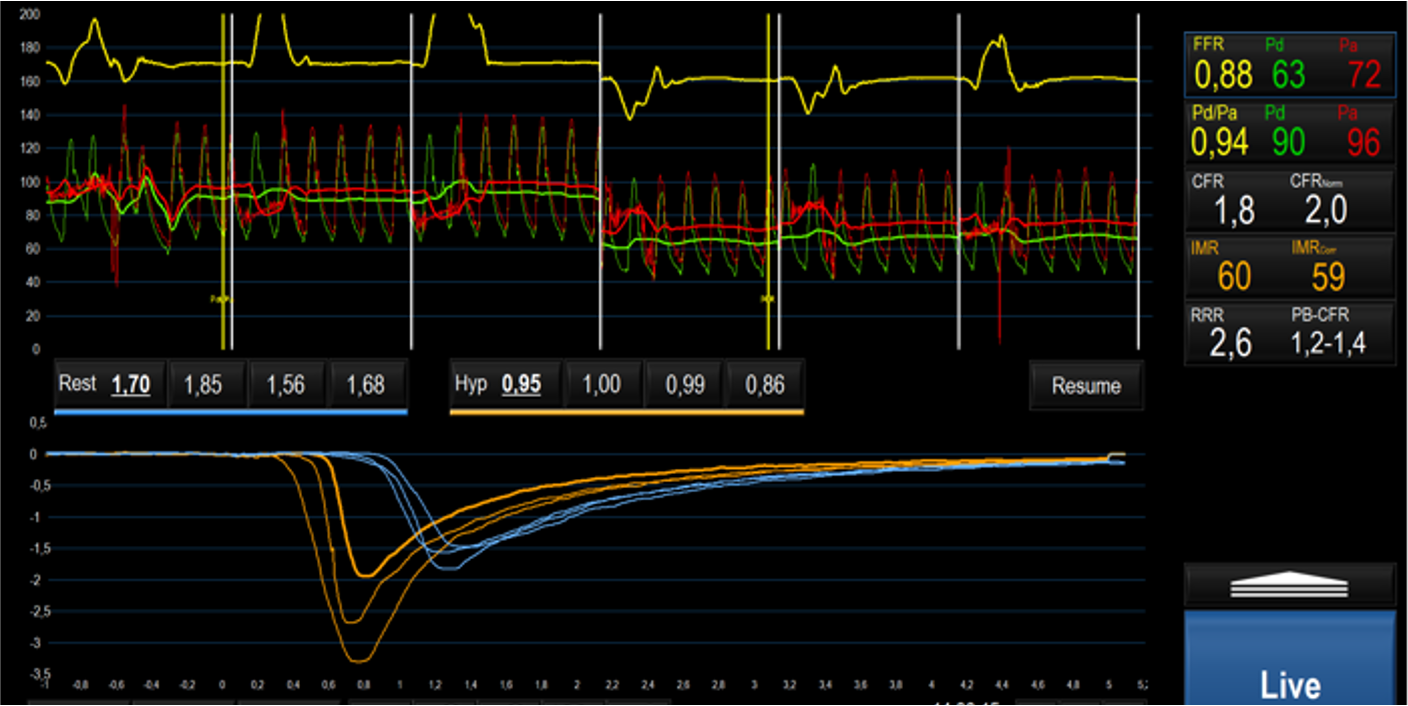 Fig. 2.Invasive assessment of CMD on left anterior descending artery through bolus thermodilution in a patient during the acute phase of TTS, characterized by high IMR and low CFR values. Abbreviations: CMD, coronary microvascular dysfunction; FFR, fractional flow reserve; Pd, distal pressure; Pa, aortic pressure; CFR, coronary flow reserve; IMR, index of microcirculatory resistance; RRR, resistive reserve ratio; TTS, takotsubo syndrome; Hyp, Hyperemia; PB-CFR, pressure bounded coronary flow reserve.