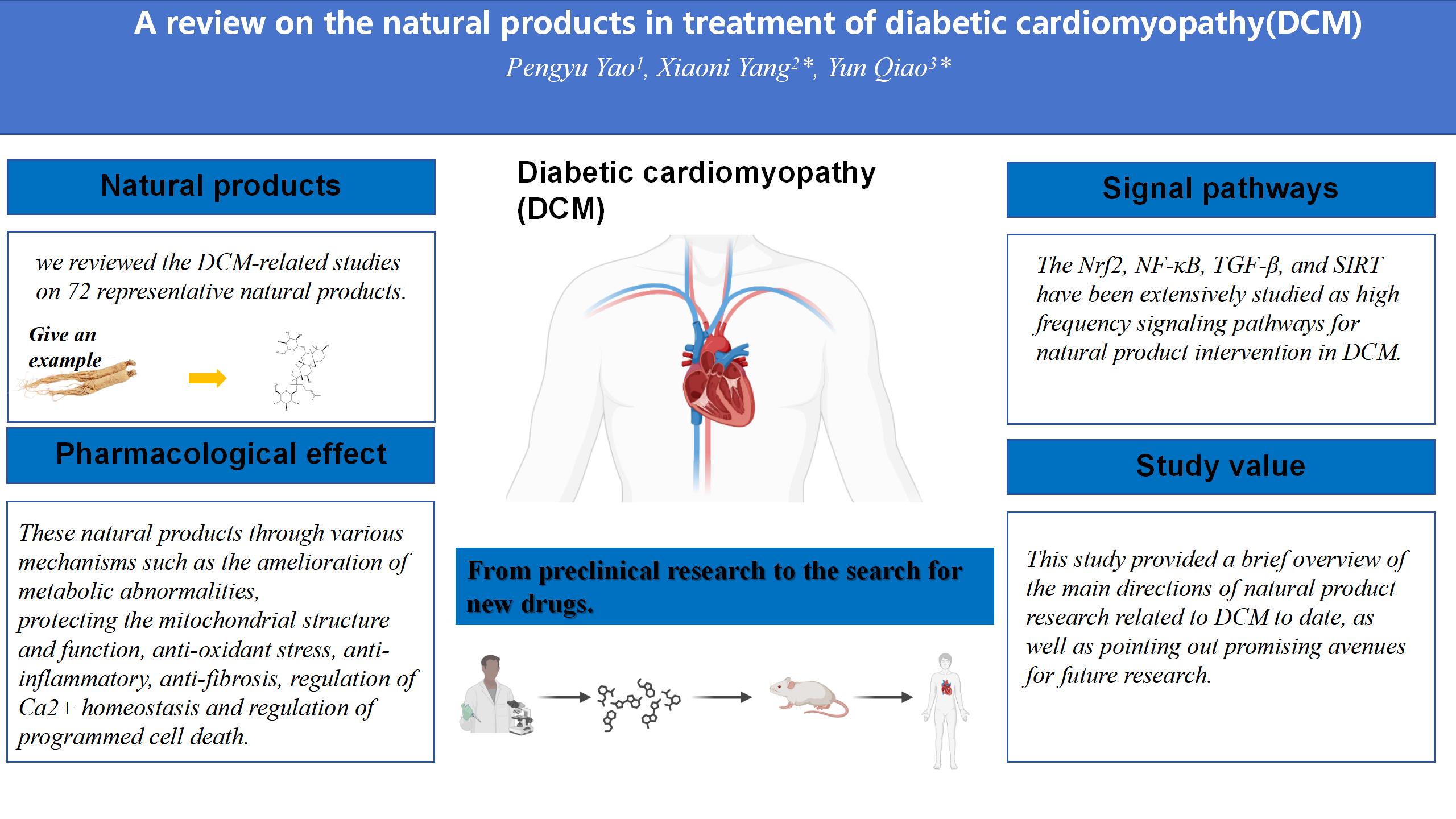 Overall, this paper provided a brief overview of the main directions of natural product research related to DCM to date, as well as pointing out promising avenues for future research. It must be noted that studies existing in the literature have been restricted to animal and cell experiments, with a lack of clinical research. Further clinical research utilizing natural products could provide more insight into the effectiveness of their complicated pharmacological properties, enabling natural products to be used safely and efficiently.
