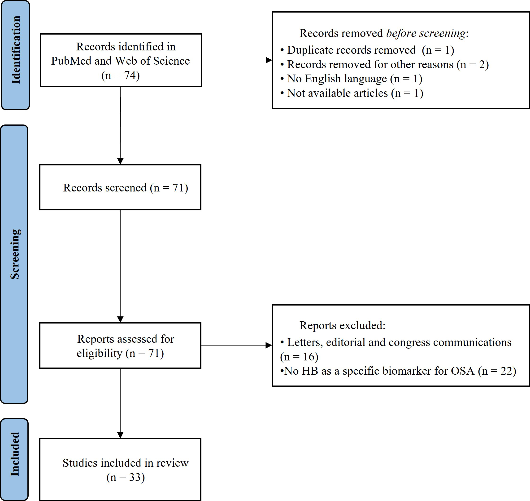 The first review of the literature identified a total of 74 studies. After the initial title and abstract research, 3 articles were excluded: 1 study was not written in the English language; 1 study was duplicated; and 1 article was not available. A total of 71 studies were screened and assessed for eligibility. After initial screening, 38 studies were removed: 16 studies were letters, editorials or communications and 22 studies did not include HB as a specific biomarker of OSA. A total of 33 studies that fulfilled the inclusion criteria and not exclusion criteria were selected for the present systematic review (Fig. 2).