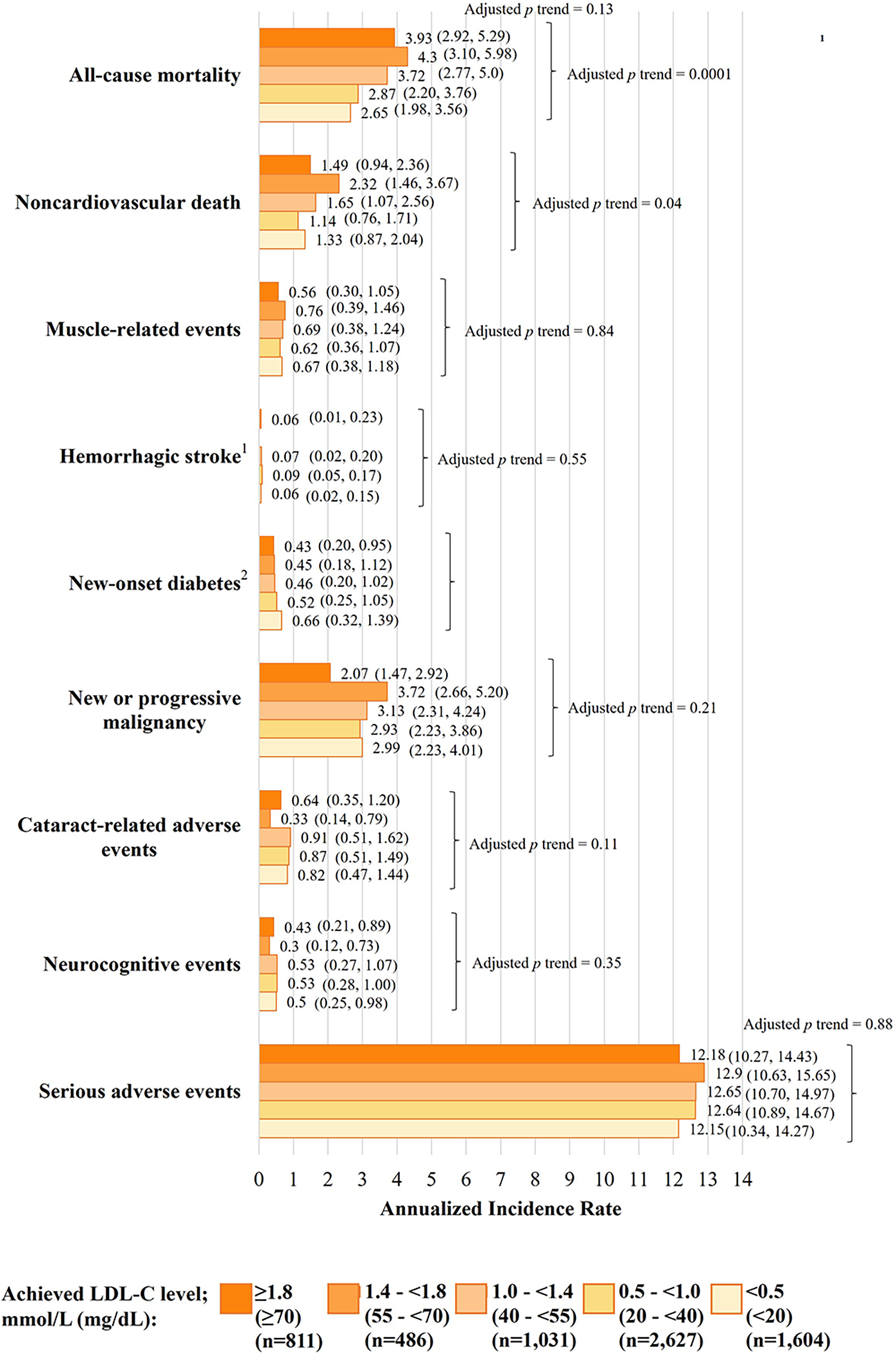 Fig. 5.Safety outcomes according to achieved LDL-C in the FOURIER-OLE