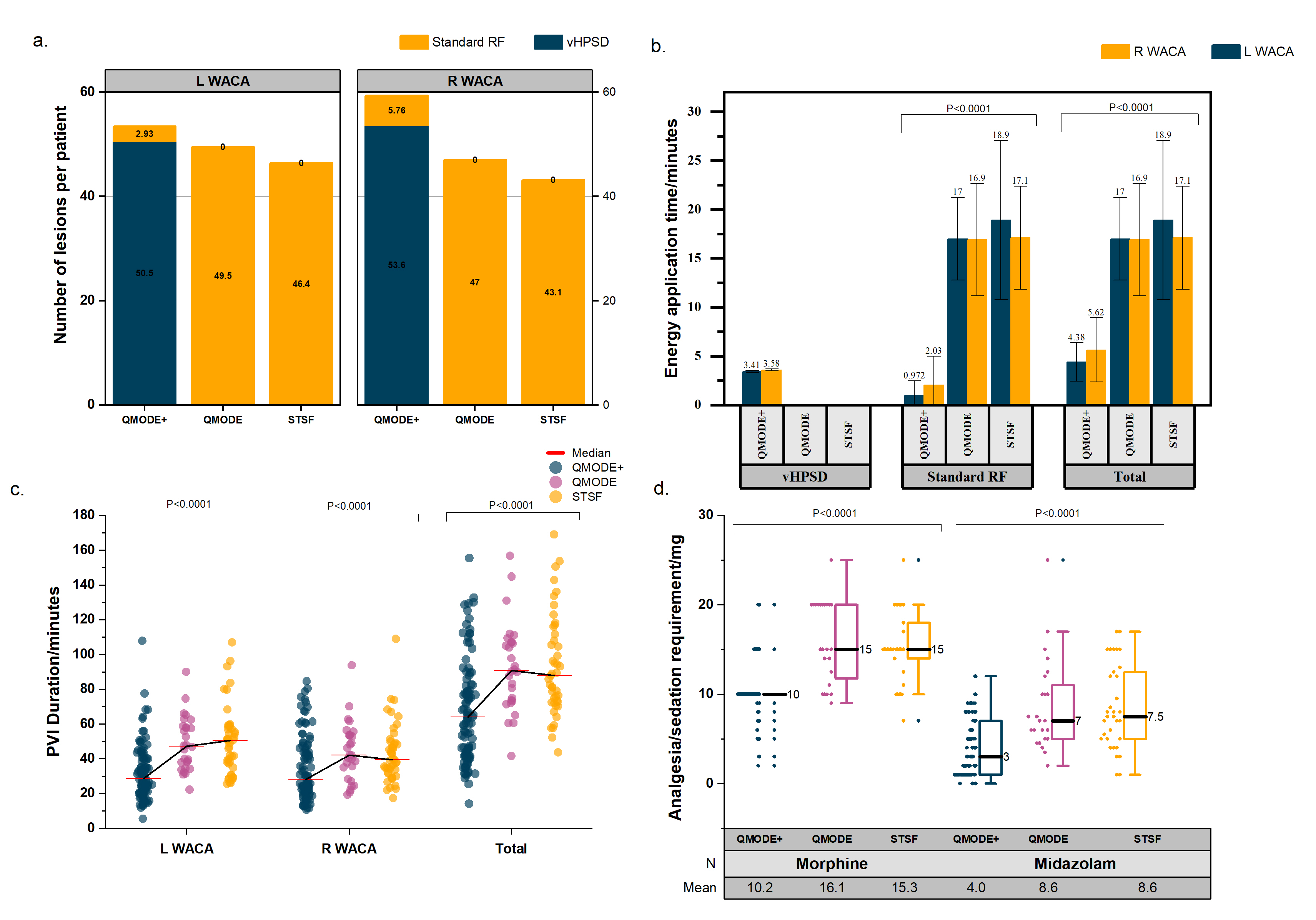 RF, radiofrequency; PVI, pulmonary vein isolation; WACA, wide area circumferential ablation; vHPSD, very high power-short duration; HPSD, high-power short duration; STSF, THERMOCOOL SMARTTOUCH™ SF; N/A, not available/applicable; L, left; R, right.