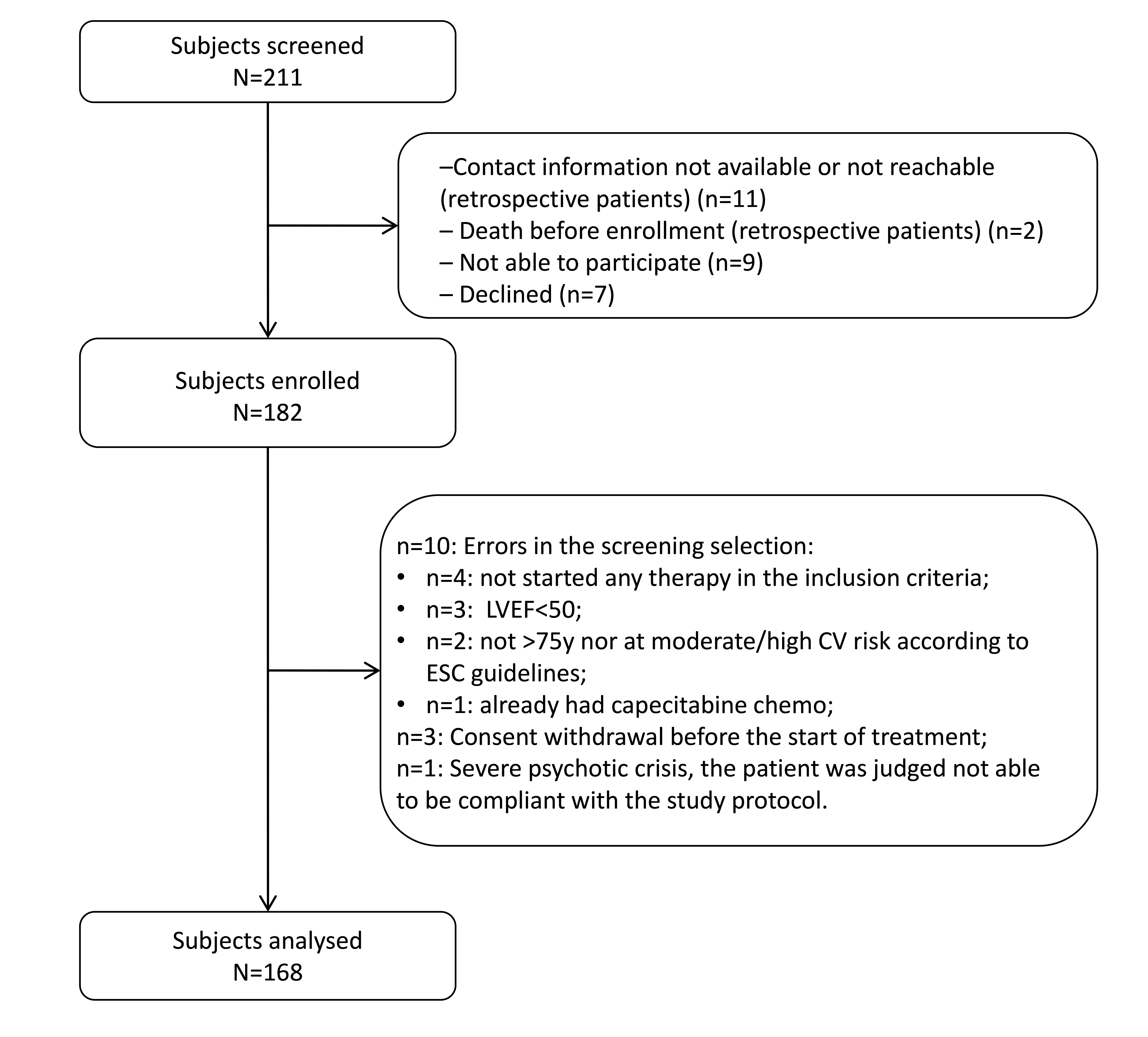 Eligible drugs for the enrollment in the study were: anthracyclines, docetaxel, paclitaxel, cisplatin, 5-fluorouracil (5FU), capecitabine, trastuzumab, bevacizumab, pertuzumab, sorafenib, sunitinib, pazopanib, lapatinib, axitinib, regorafenib, everolimus, tamoxifen and abiraterone. These drugs are known to be associated with CV toxicity, according to 2020 European Society of Medical Oncology (ESMO) consensus recommendations [21].