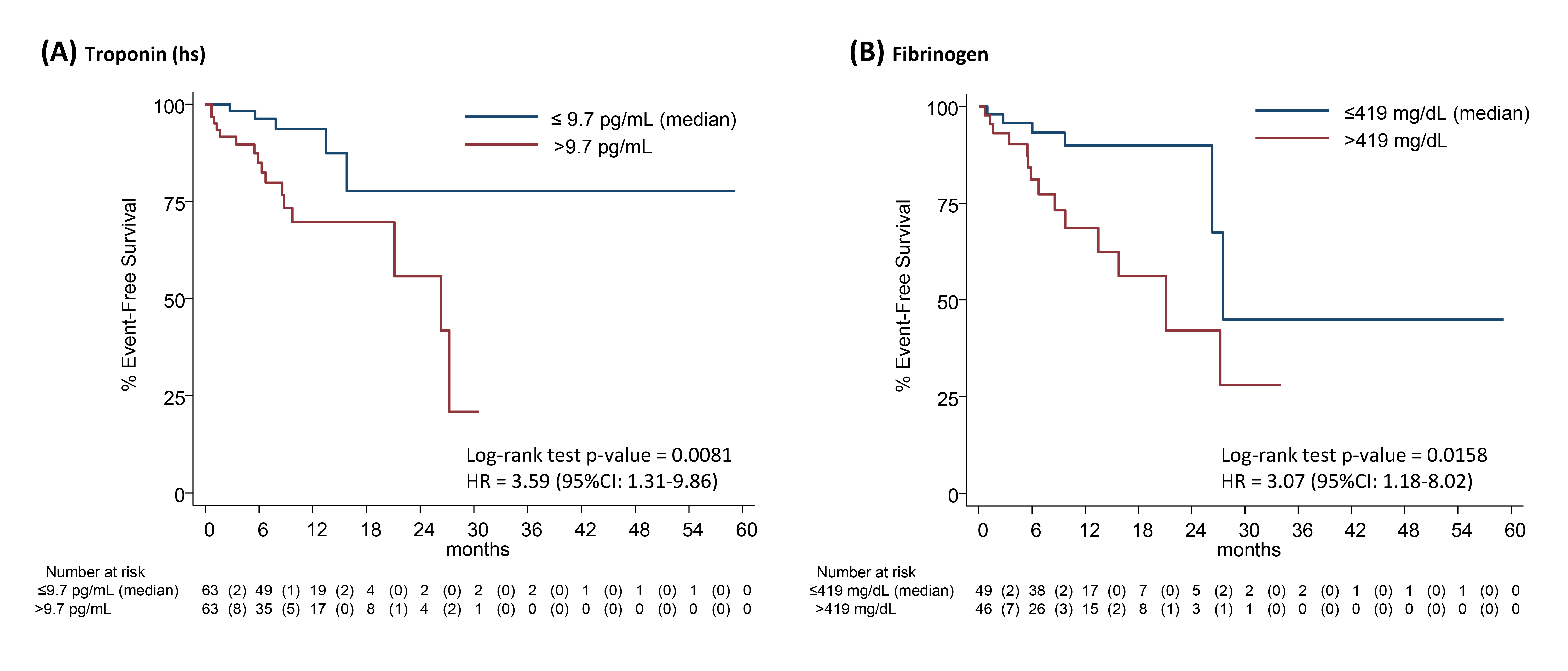 Fig. 2.Kaplan-Meier estimates of cumulative event-free survival rate, by median levels of Troponin (hs) (panel A), and of Fibrinogen (panel B). Numbers in parentheses represent the number of events within each time interval. The estimate of the hazard ratio (HR) was based on a univariate Cox proportional hazards regression model. hs, high-sensitivity.