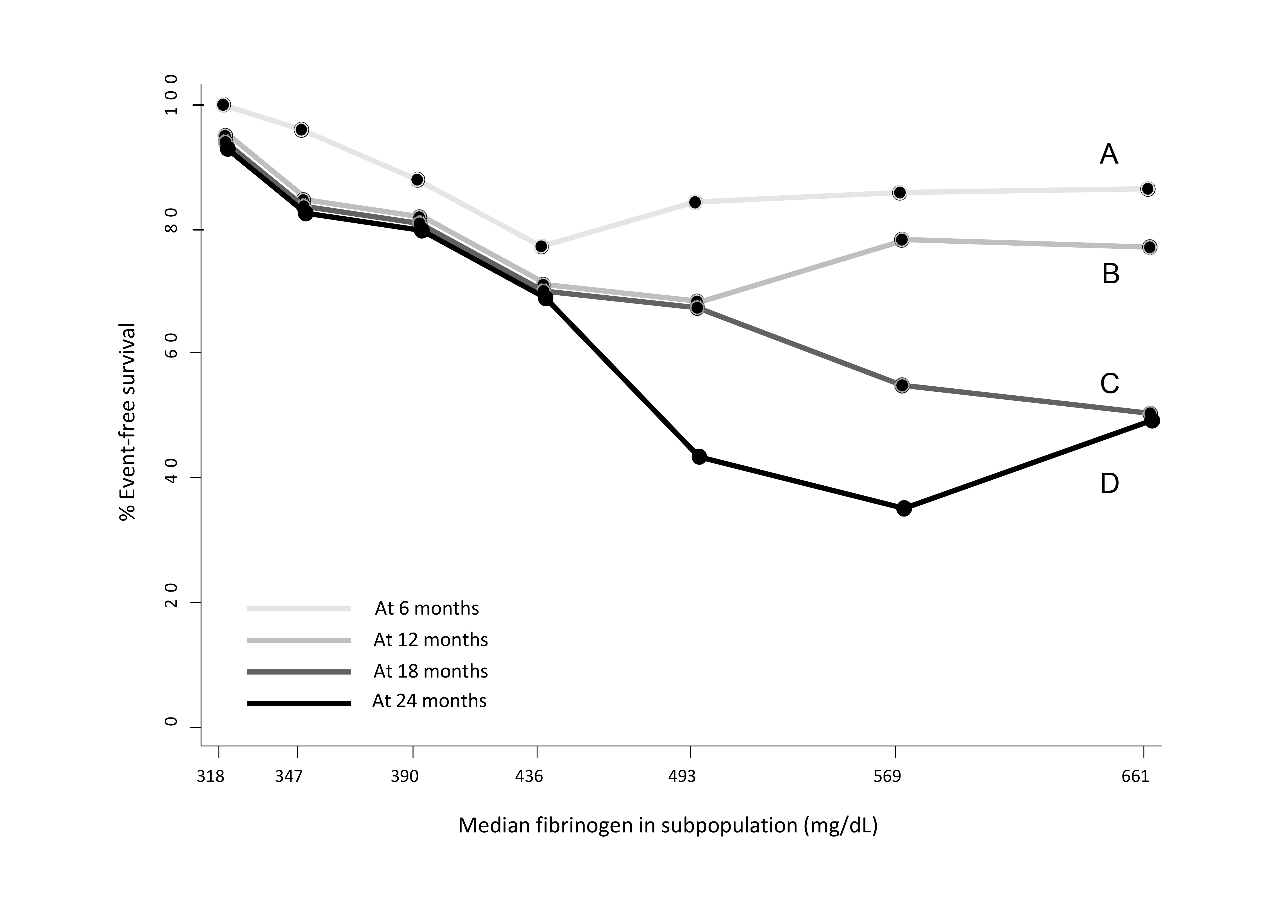 The STEPP graphical technique applied to the time-to-event data clearly showed a relationship between subpopulations with increasing fibrinogen levels and decreased event free survival over time (Fig. 3).