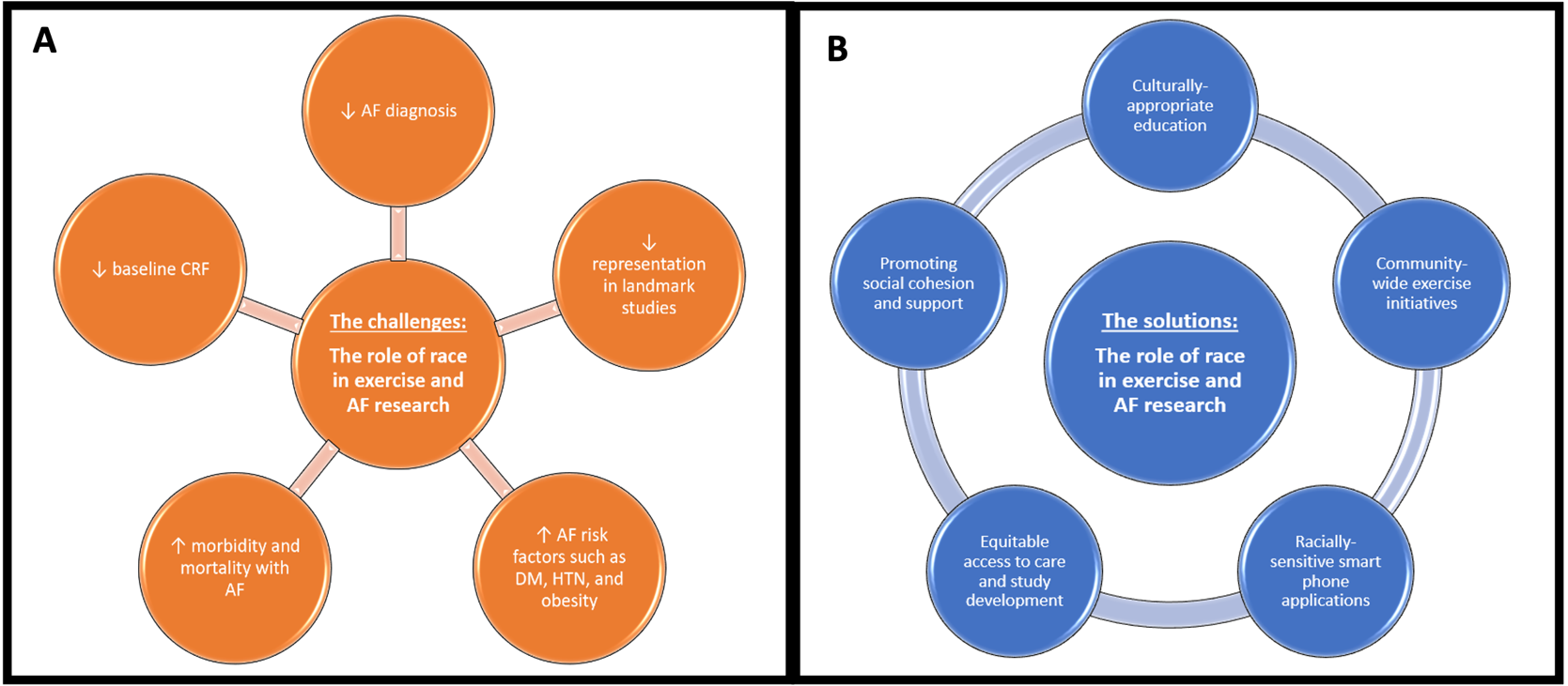 Fig. 1.The obstacles and solutions observed in the investigations examining atrial fibrillation (AF) and exercise. (A) Issues related to performing research in minority groups and the unique challenges they face. (B) Successful initiatives in vulnerable racial populations. CRF, cardiorespiratory fitness; DM, diabetes mellitus; HTN, hypertension.