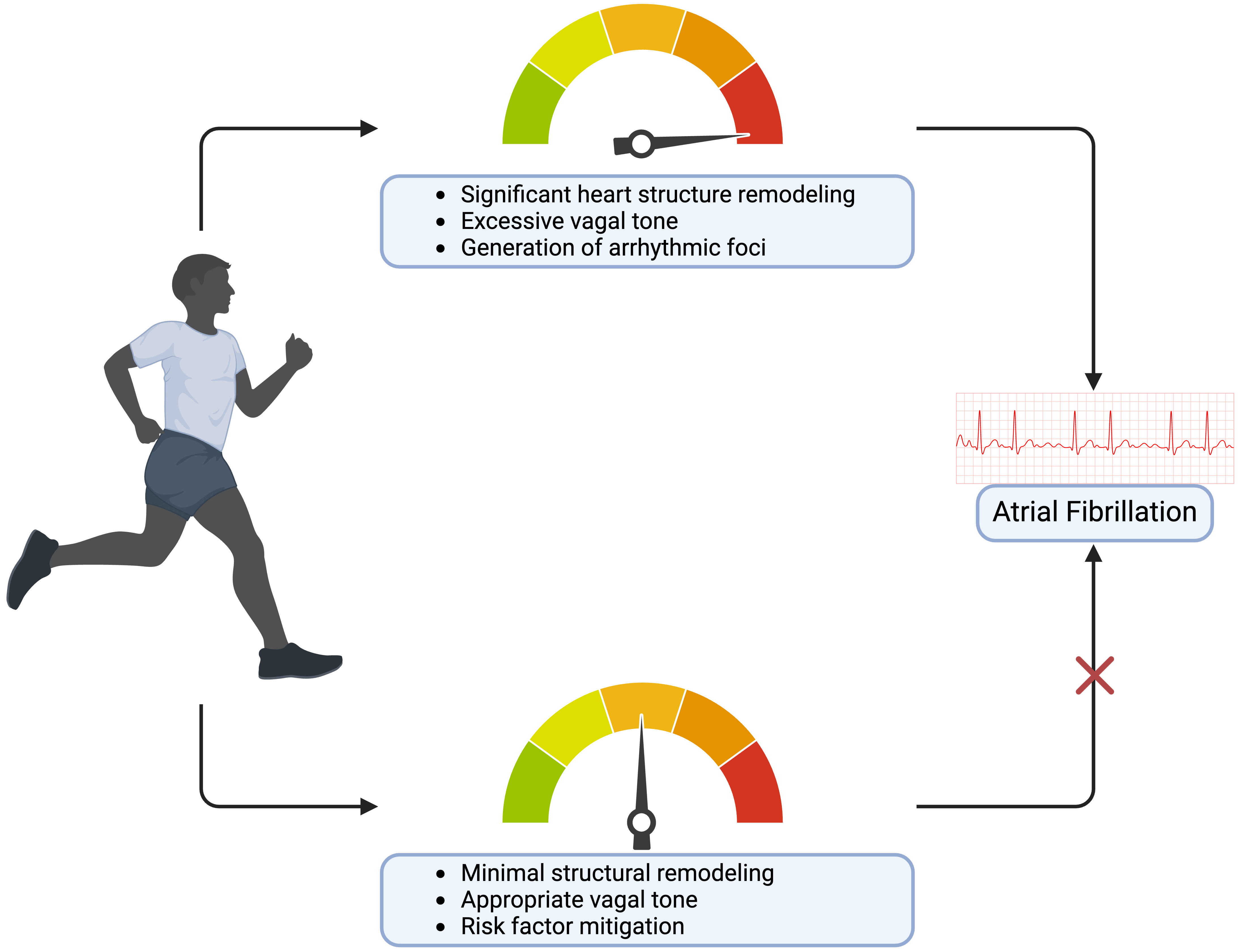 Fig. 2.The risks and benefits of varying exercise levels on atrial fibrillation. Created on https://www.biorender.com/.